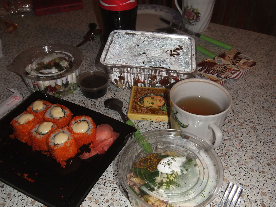 Zu Hause bestellten wir Essen. Salate, Sushi für mich und Zunge für jemanden. Das schmeckte alles ganz gut, nur auf Sushi war Mayonnaise! Nichts ist in Russland vor Mayo sicher. Alles in allem aber OK, wenn auch Sushi sehr teuer ist.