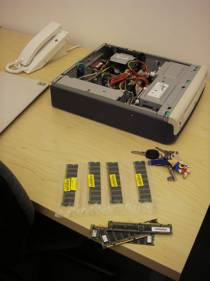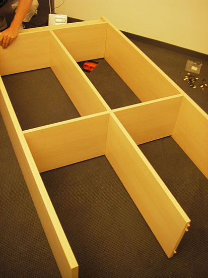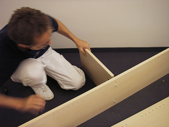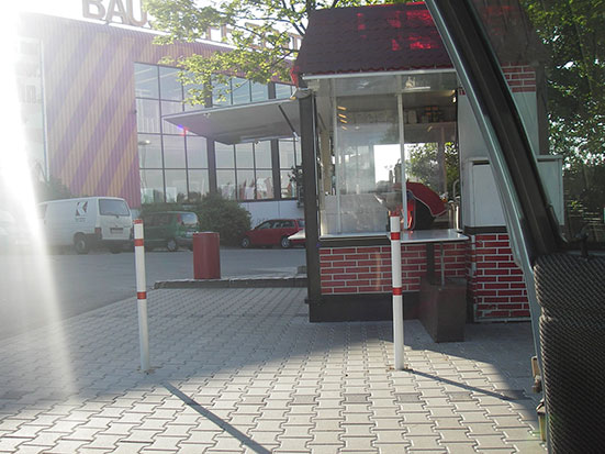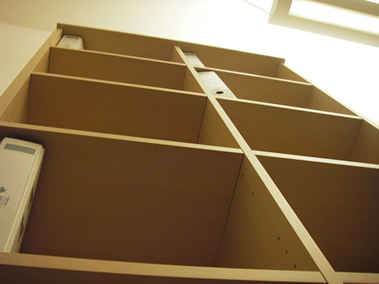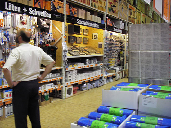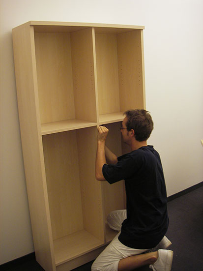Erst mal zu Hornbach. Ich musste was essen – Leberkäse. Im Baumarkt dann Steckdosen geholt und wieder in die Stadt. Das erste Regal wurde im Büro aufgebaut. Dutzende Dübel und Schrauben. Da brauchten wir lange.