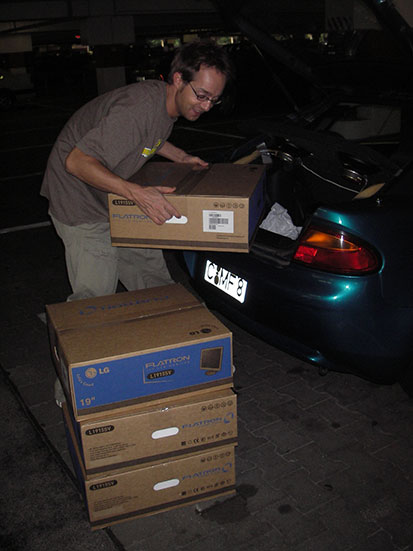 Deutschland – Mexico spielte und wir machten los in den Mediamarkt. Heute wollten wir 4 Monitor holen. Ich schaute kurz vorher nochmal im Web. Der Yakumo im Kaufhof ist OK, LG finde ich besser. Im MM gab’s ’nen hässlichen Gericom für €200. Eigentlich nicht schlecht aber neh. Ein ordentlicher 17“ er kostet genausoviel. So sieht’s aus. Glücklicherweise handelte mein Bruder bissel war heraus. €60 EUR für 4 Stück (15€ pro). Machte bissel was über €1000.