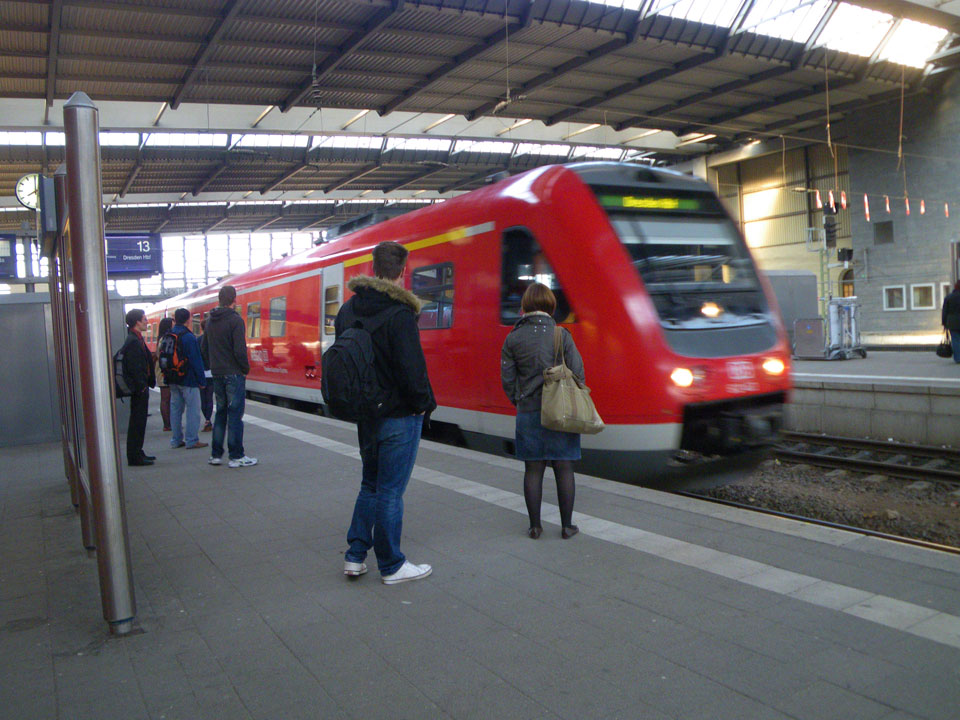 Wecker um 7, langsam raus und schnell Kaffee und Essen. Der Toaster ist kaputt, in der Microwelle musste die Grillfunktion den Toast erwärmen – mäßiger Erfolg. Ich war rechtzeitig fertig, auf dem Bahnhof und im Zug nach Dresden. Auf geht’s!