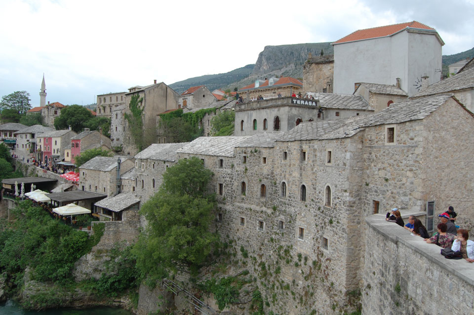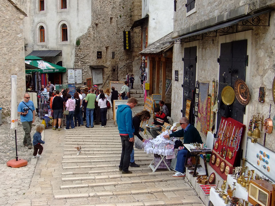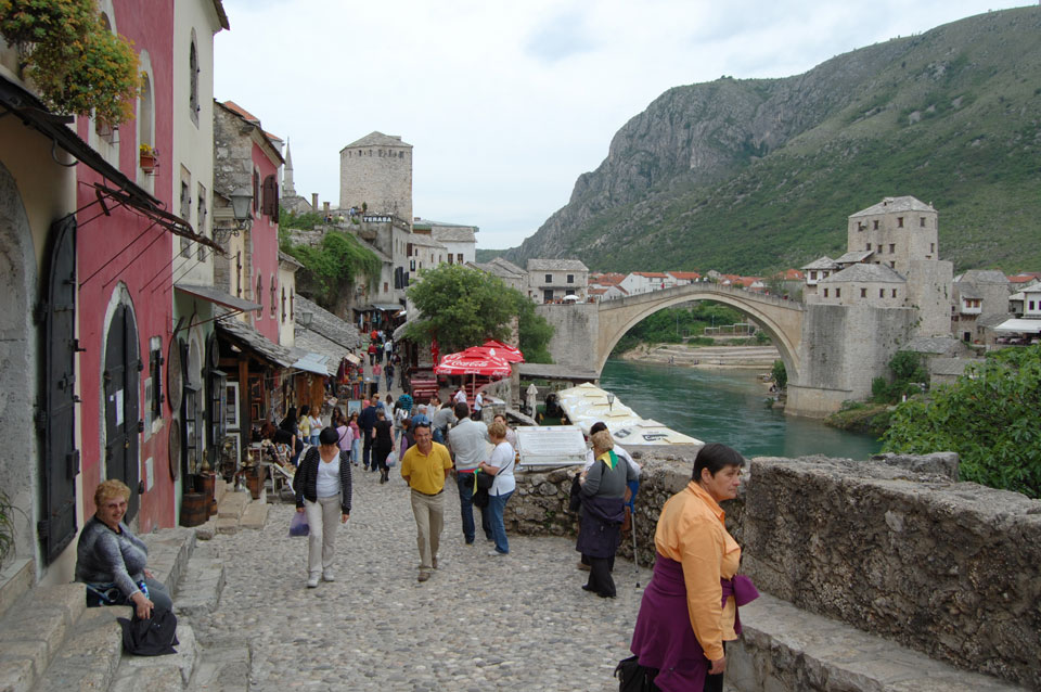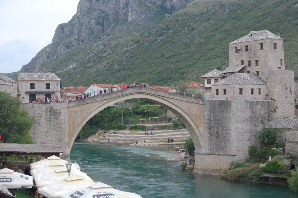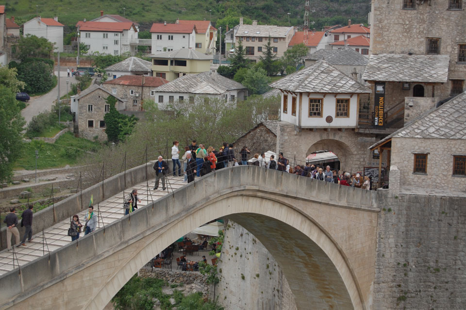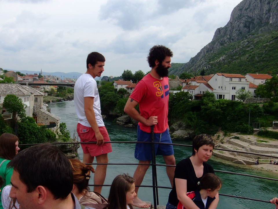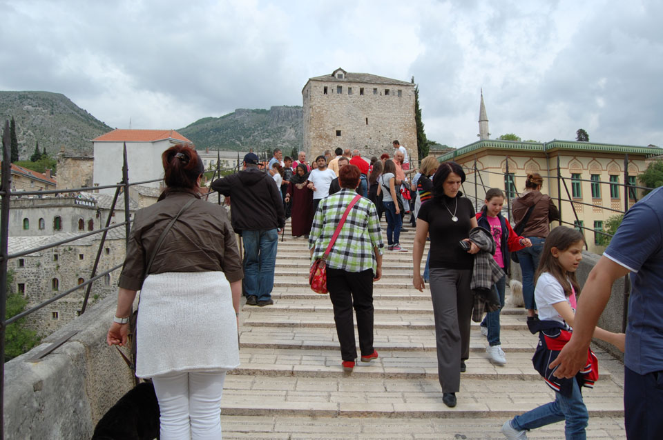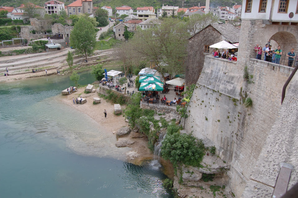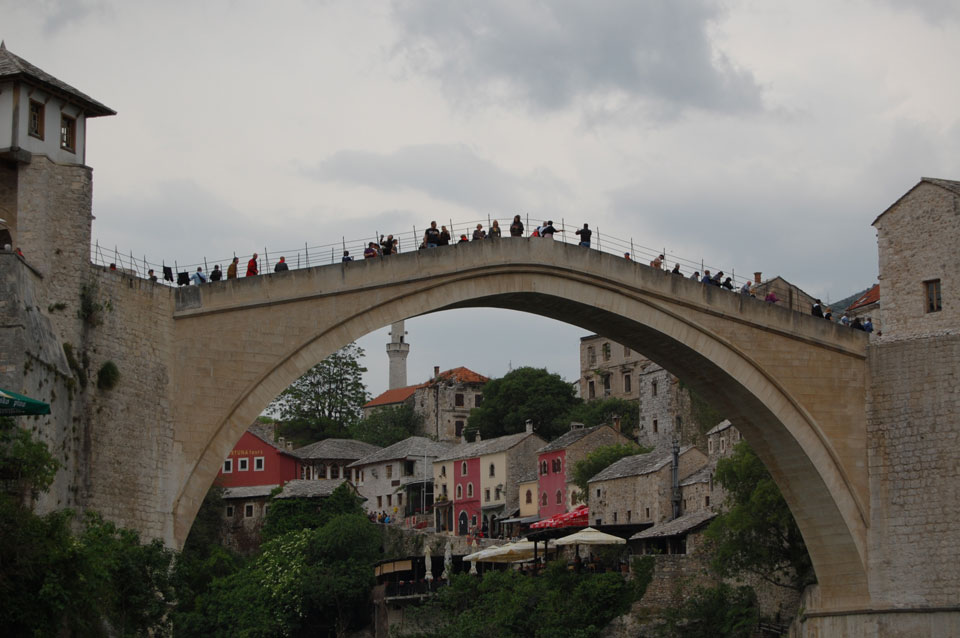 Die Altstadt war nicht weit. Auf der berühmten Brücke, die während des Balkan-Krieges zerstört wurde, waren jetzt viele Touristen und auch ein paar Anwerber für Spenden eines Springers. Die 21m hohe Brücke sieht ziemlich hoch aus. Dann sprang einer und ich hatte es auf Video. Respekt!