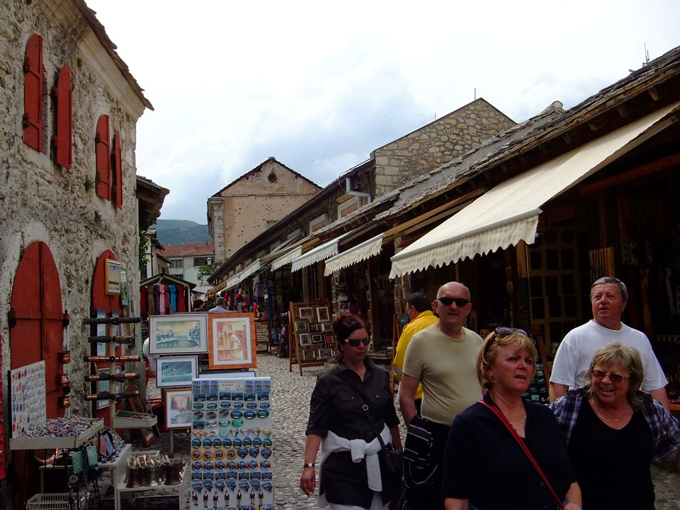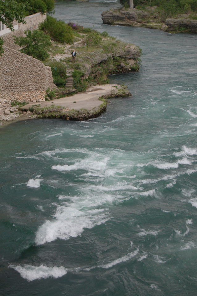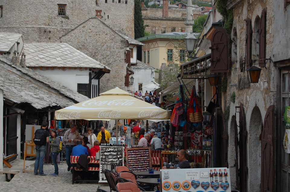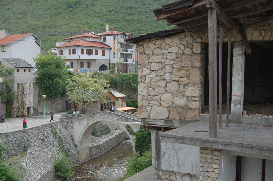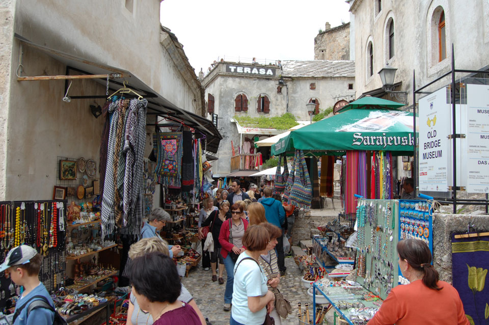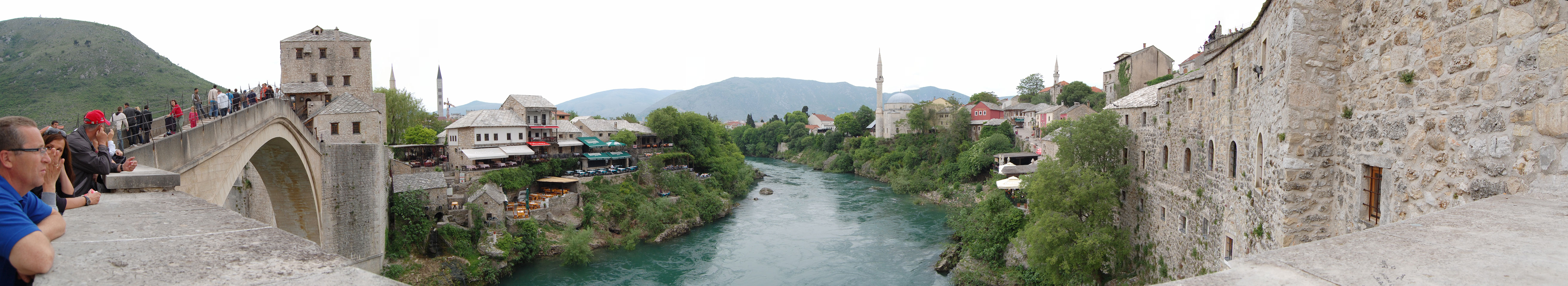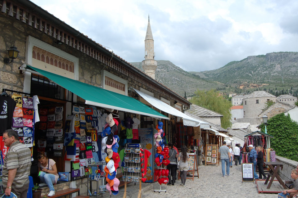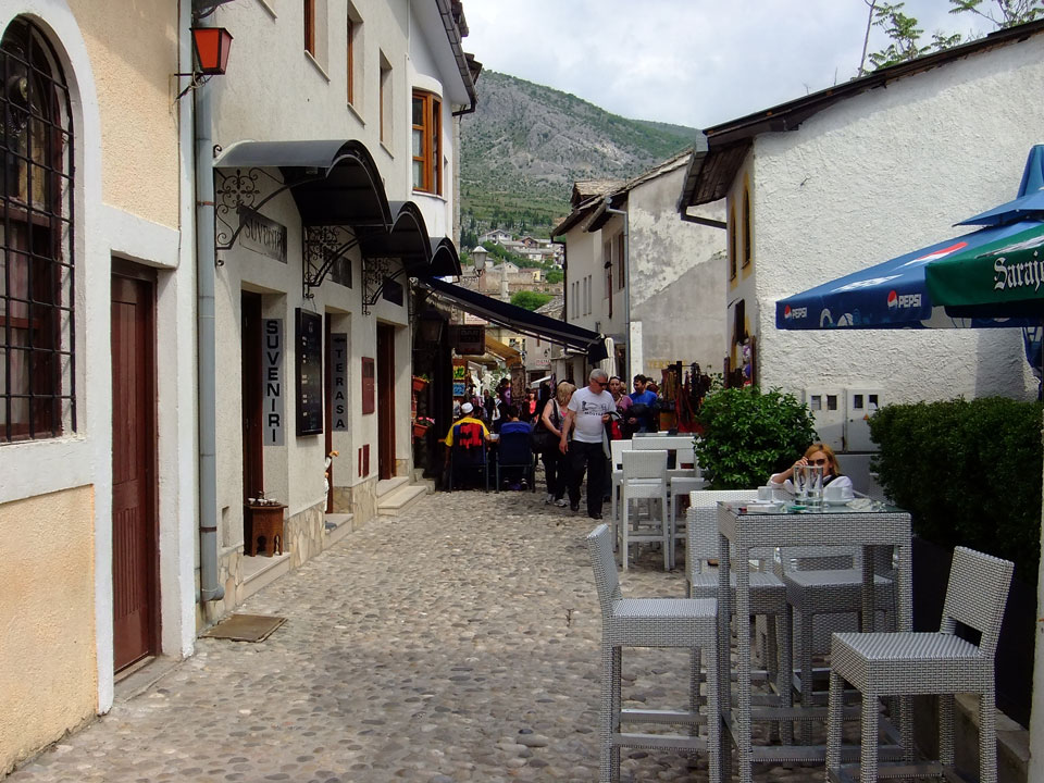 Die Altstadt war nicht weit. Auf der berühmten Brücke, die während des Balkan-Krieges zerstört wurde, waren jetzt viele Touristen und auch ein paar Anwerber für Spenden eines Springers. Die 21m hohe Brücke sieht ziemlich hoch aus. Dann sprang einer und ich hatte es auf Video. Respekt!