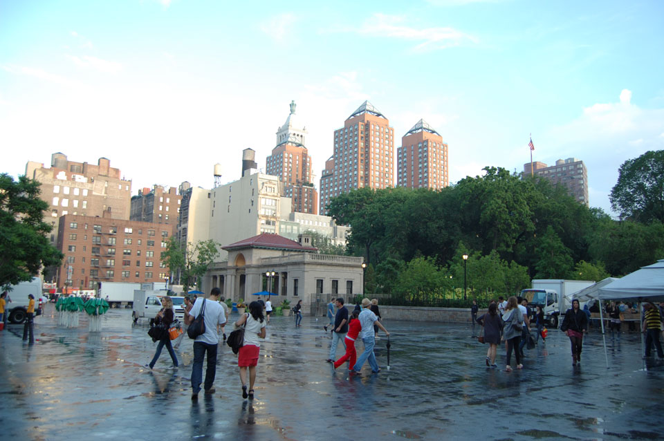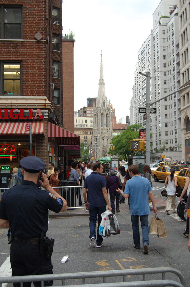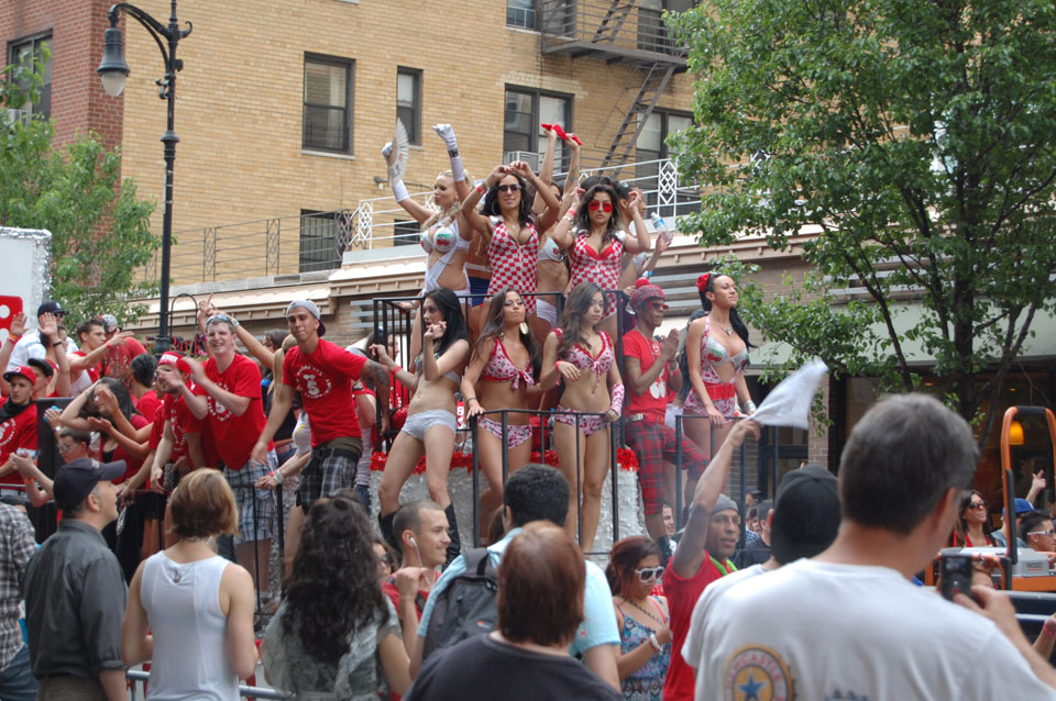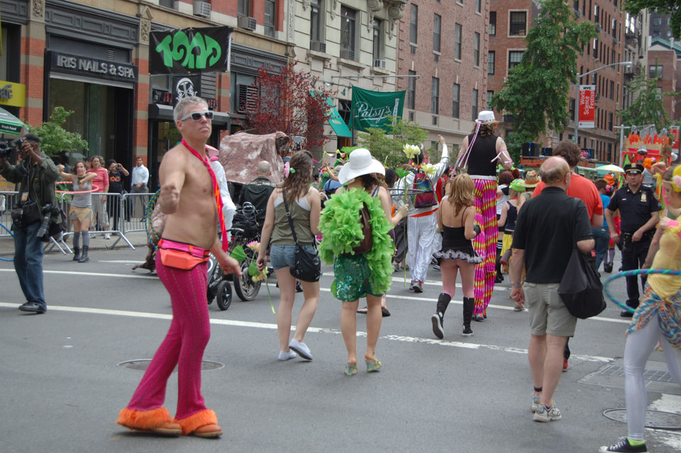Mit der Metro zur 14th Street, dann weiter Richtung Broadway. Jetzt um 3 war die Parade fast vorbei und ich sah noch die letzten 3 Gruppen. Eine Trommler/Blasmusikkapelle, dann Goa-Freaks, die in ihren Neokostümen lustig aussahen. Ich holte mir ’nen Burger bei „Burger Creations“ und hörte dann Dance Mukke – es war der Pacha-Wagen. Das alles hatte irgendwas von Love Parade, war damit aber schon vorbei.