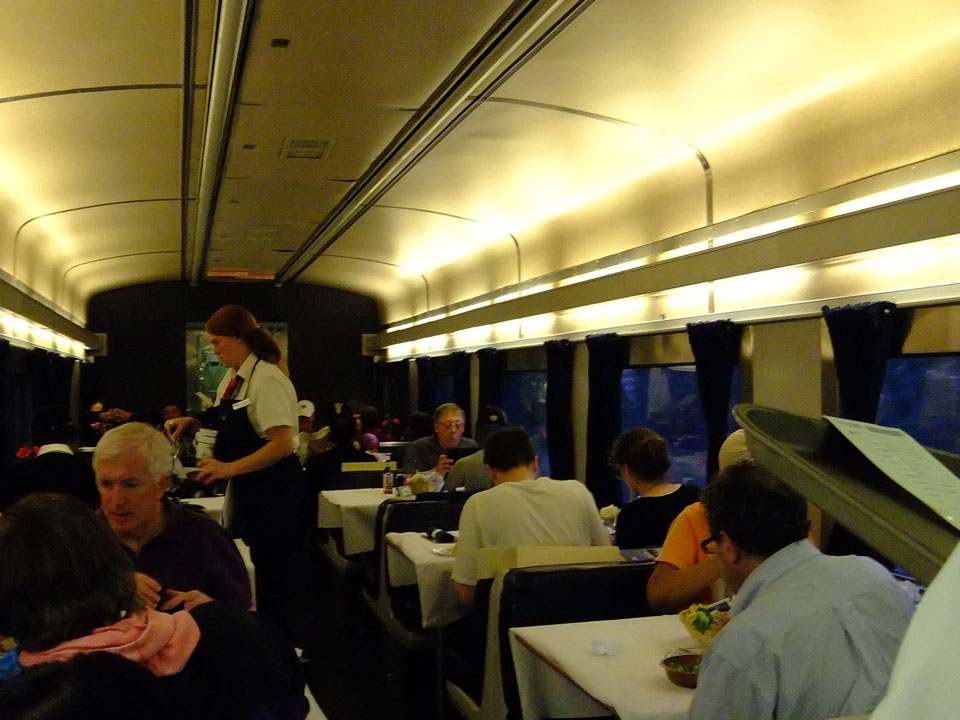 Das Abendessen im Zug finde ich immer besonders cool. Ich hatte Schweinerippchen, was auch gut und viel war. Für ca. $25 mit Dessert war alles OK. Schlafen konnte ich nicht so gut, ist eben trotz gigantisch viel Beinfreiheit nur ein Sitzplatz. Die Nacht im Zug.