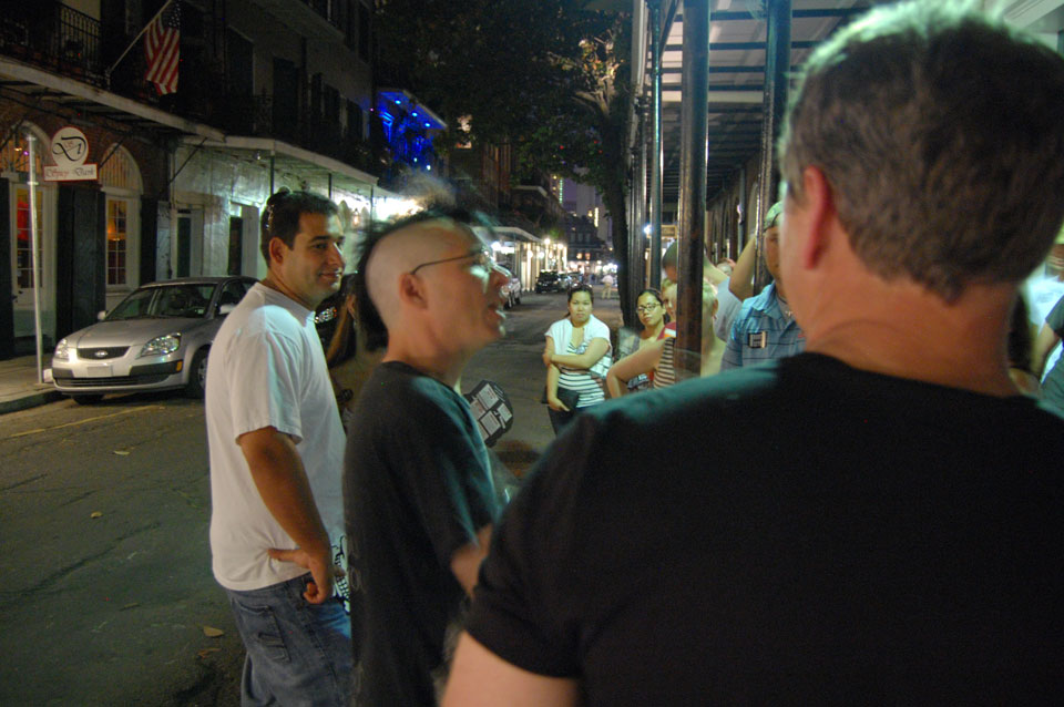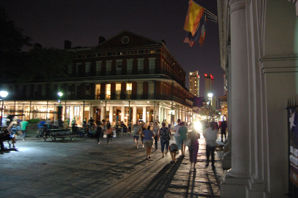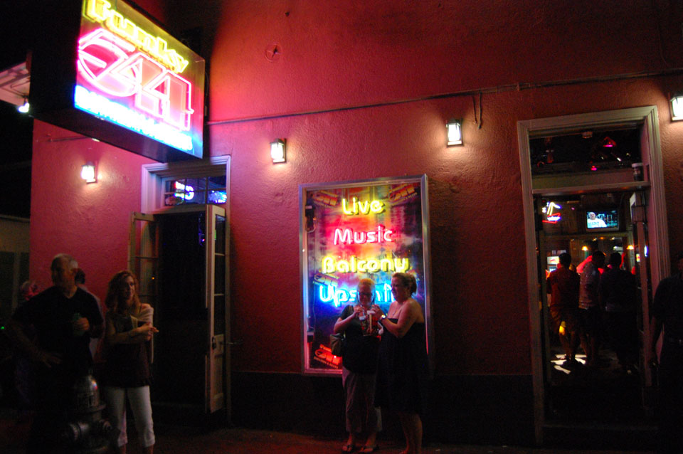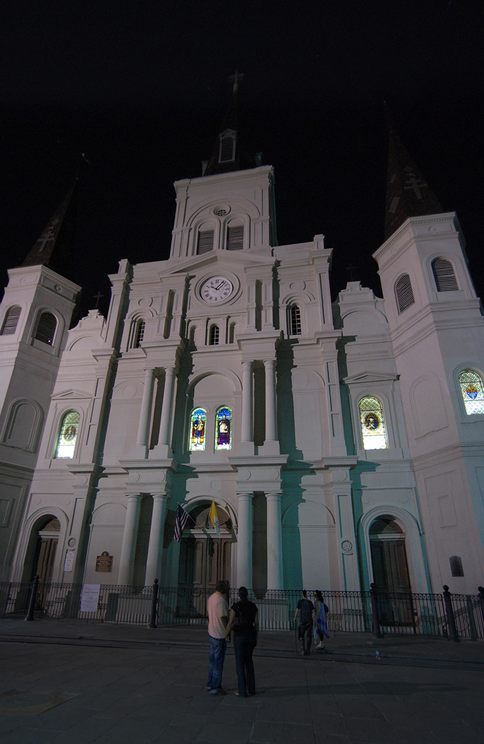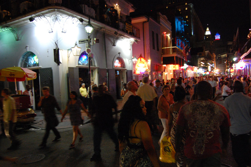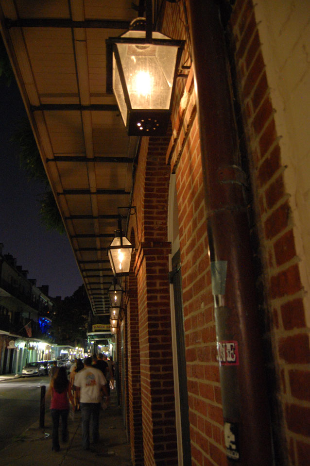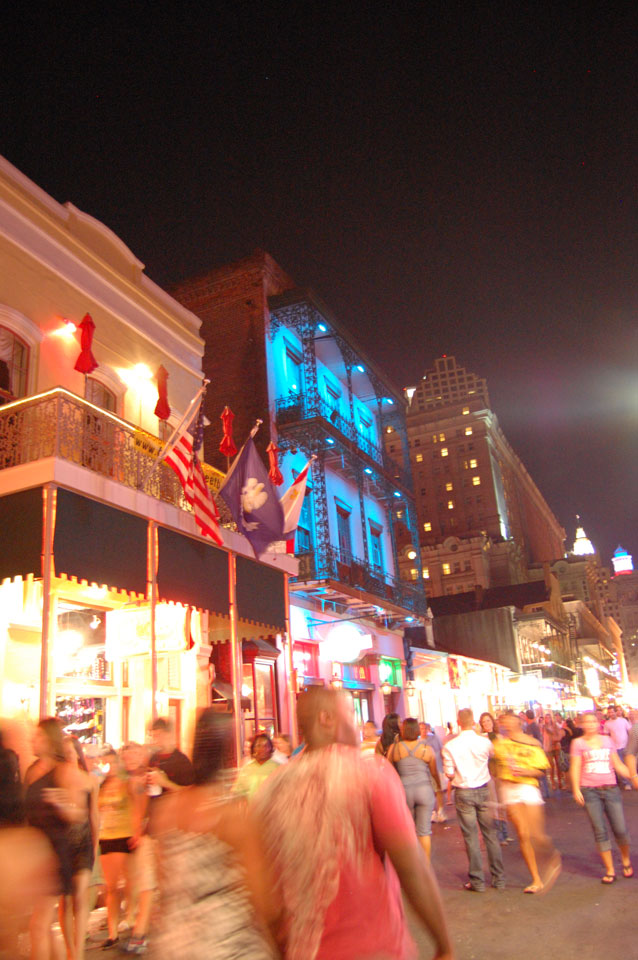 Ein Typ redete extrem viel irres Zeug über diverse fiktive und reale Geistergeschichten. So richtig gruselig war das alles nicht, bis auf’s letzte Haus, wo ein verrückter Arzt und eine merkwürdige Frau ihre Sklaven mißhandelten und wohl Horror-Operationen an denen durchführten. Das war schon heftig, alle müde vom vielen Laufen und Stehen. Nach 2 Stunden war’s dann vorbei und mit der D40 konnte ich auch ein paar bessere Nachtaufnahmen der Bourbon Street schießen. Hier fühlt man eher Geschichte als in so vielen anderen US-Städten. Echt nett.