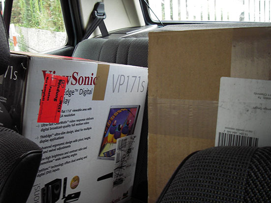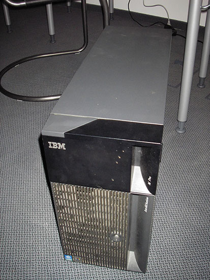 Kurz nach 6 traf auch schon ein Kumpel ein und half beim Transport von der Garage ins Zimmer. Alles ausgepackt, wieder ein paar m² Müll und einen fetten schwarzen IBM Rechner. Dickes Teil, sieht etwas mitgenommen und verstaubt aus aber das kann man putzen. Wenn nur alles klappt – werde ich bald sehen. Der portable PCIII war witzig. Mit tragetasche, Henkel und Klappmonitor ist das etwas kurios. Der 15“ IBM TFT passt super in den Serverraum. Alles bestens, Funktionstests später.