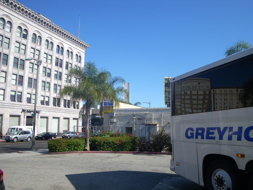 Ich wurde zur Greyhound Station im alten Las Vegas gefahren. Dort sieht alles ziemlich trostlos aus. Eine recht lange Schlage vor dem Bus nach Hollywood. Dann rein und ein Sitzplatz für mich. Der Platz neben mir roch aber schlimm und sah auch dreckig aus. Da hatte wohl vor einiger Zeit jemand draufgebröselt. Insgesamt machte der Bus einen schlechten Eindruck, uralt und dreckig.