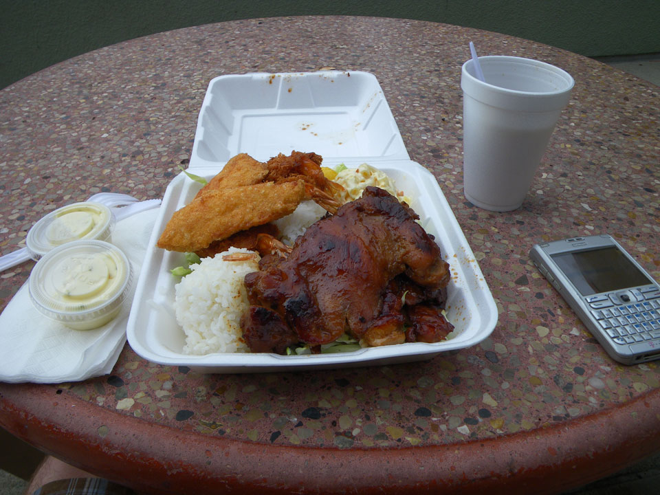 Bei L&L holte ich mir die Seafood Combo, was viel zu viel war. Da habe ich später noch was davon. Weil sie in dem Hawaiianischen Fastfood Ding sehr freundlich waren: $5 Tip.
