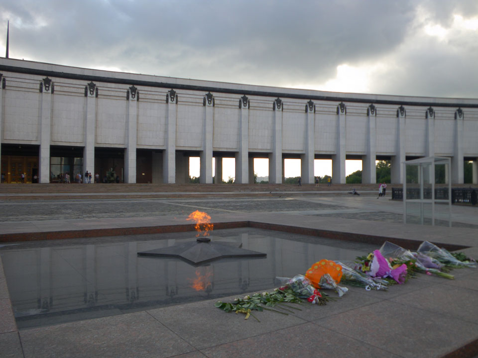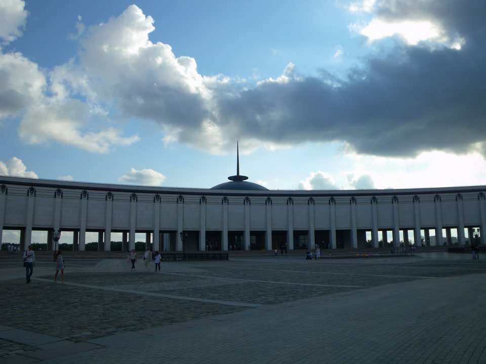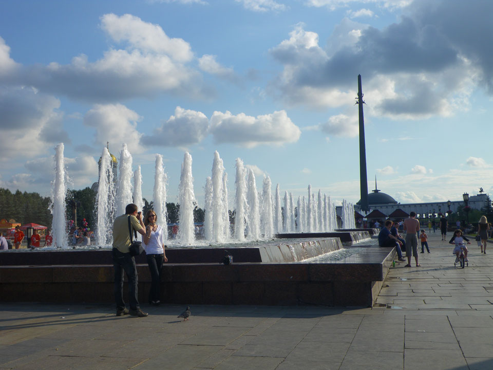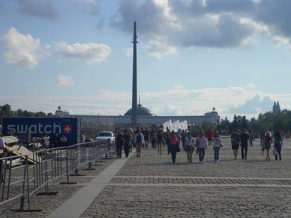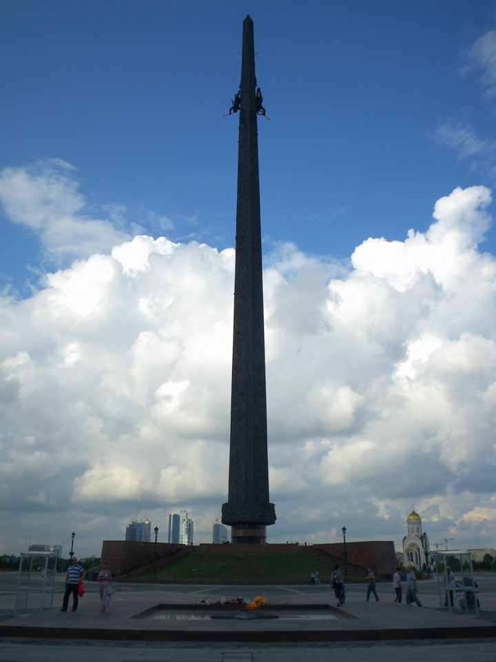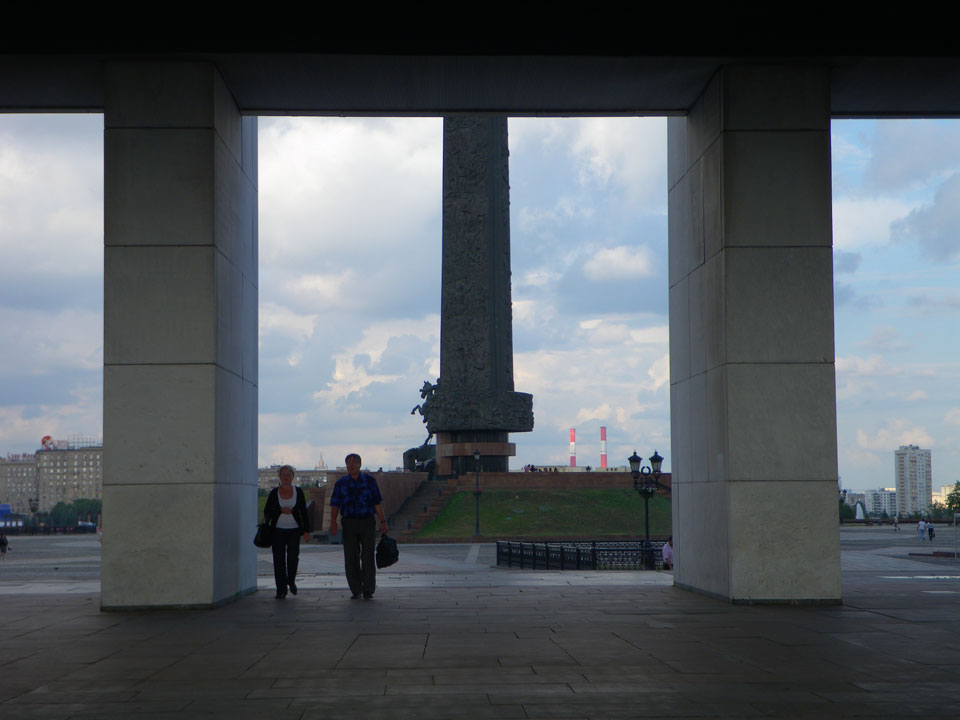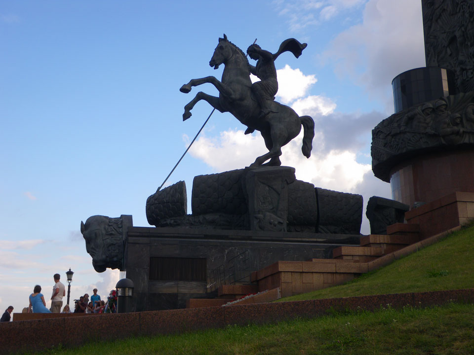 Dort wollte ich gleich mein Ticket für morgen kaufen. Überraschend wenig Leute standen da an und in ca. 20′ hatte ich ein Ticket und noch vie Zeit. So fuhr ich zum Park Pobedy, der mit empfohlen wurde. Dort gab’s eine kostenlose Pepsi, dann stiefelte ich eine Weile rum und verschwand wieder in der Metro, bevor es richtig zu regnen anfing. Die Erinnerung an den zweiten Weltkrieg wird hier an vielen Orten wach gehalten. Ein reiter schlug da in einem Monument ’nem Hakenkreuz-Drachen den Kopf ab.