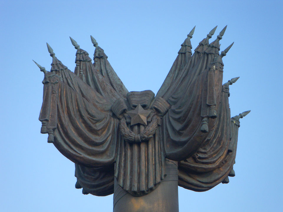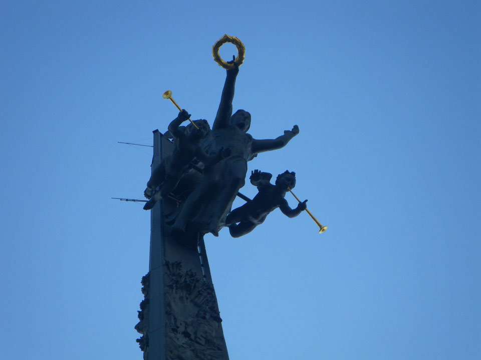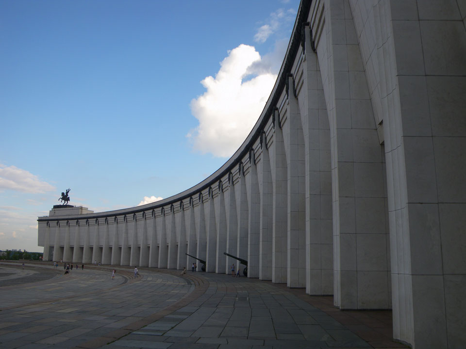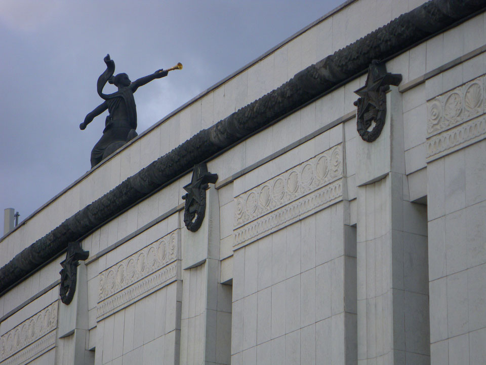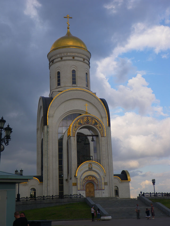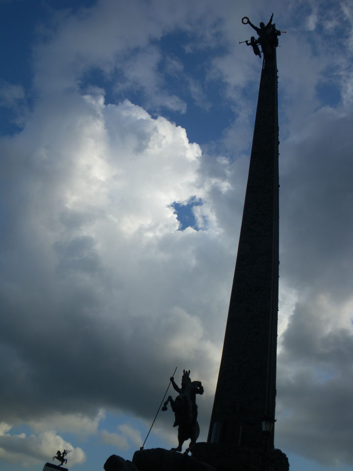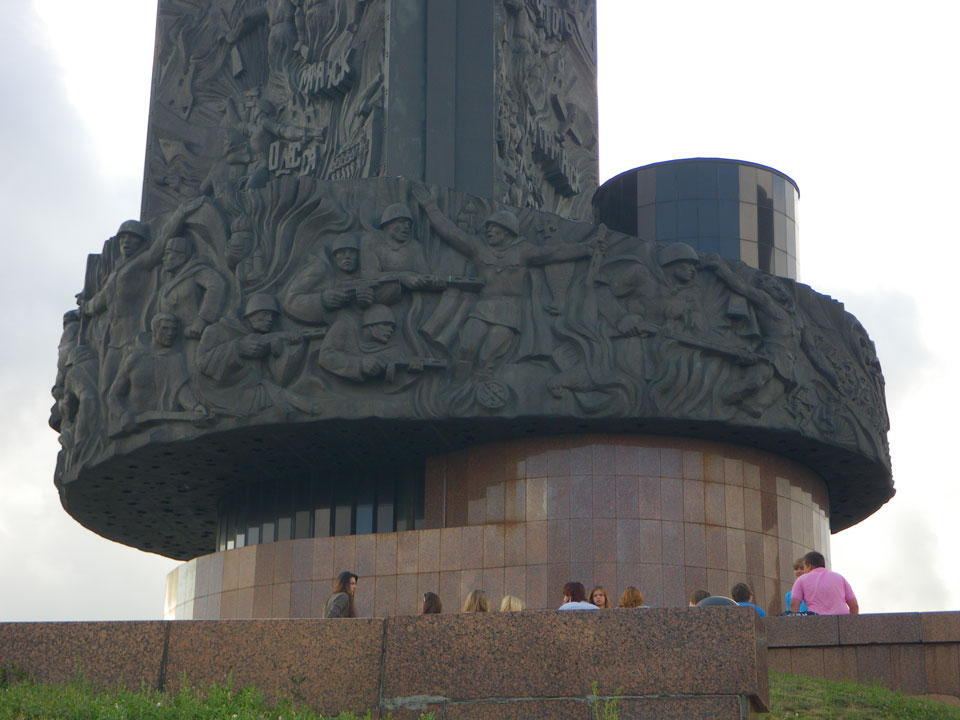Dort wollte ich gleich mein Ticket für morgen kaufen. Überraschend wenig Leute standen da an und in ca. 20′ hatte ich ein Ticket und noch vie Zeit. So fuhr ich zum Park Pobedy, der mit empfohlen wurde. Dort gab’s eine kostenlose Pepsi, dann stiefelte ich eine Weile rum und verschwand wieder in der Metro, bevor es richtig zu regnen anfing. Die Erinnerung an den zweiten Weltkrieg wird hier an vielen Orten wach gehalten. Ein reiter schlug da in einem Monument ’nem Hakenkreuz-Drachen den Kopf ab.