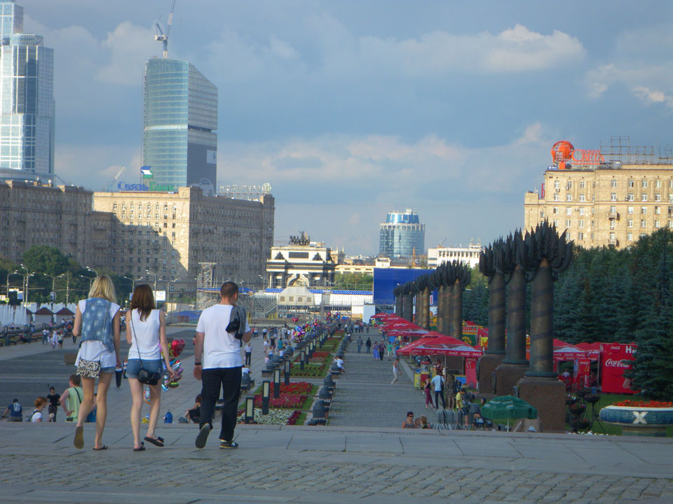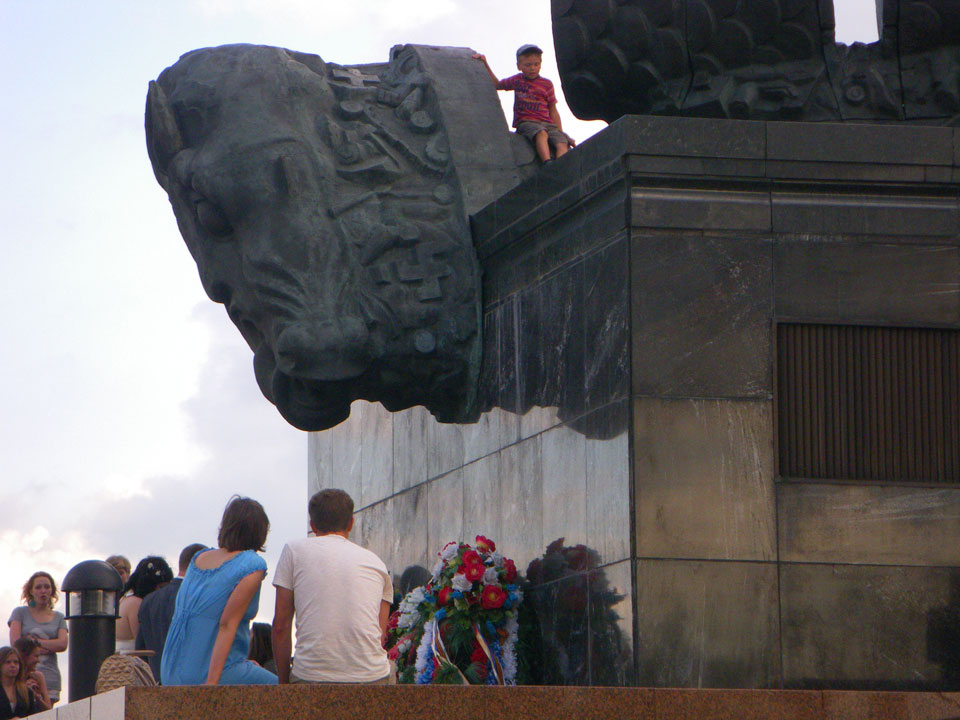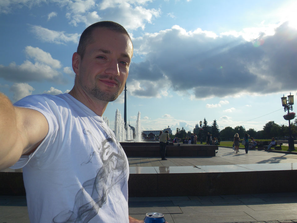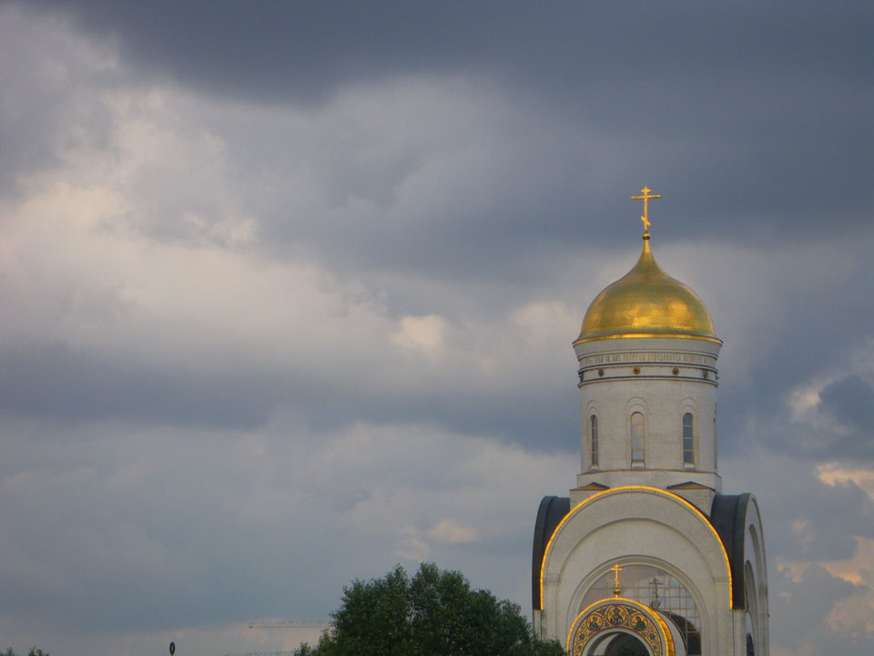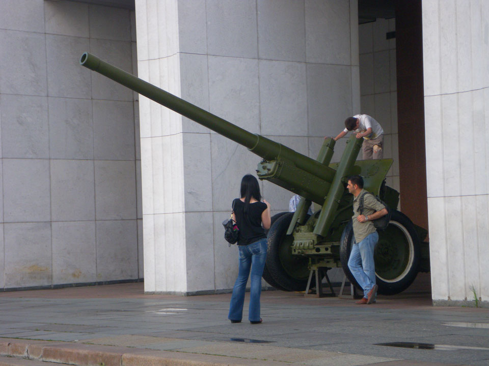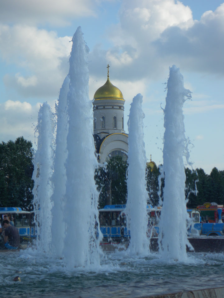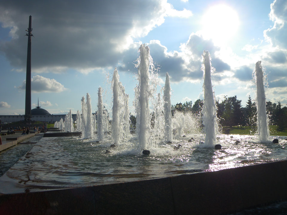 Dort wollte ich gleich mein Ticket für morgen kaufen. Überraschend wenig Leute standen da an und in ca. 20′ hatte ich ein Ticket und noch vie Zeit. So fuhr ich zum Park Pobedy, der mit empfohlen wurde. Dort gab’s eine kostenlose Pepsi, dann stiefelte ich eine Weile rum und verschwand wieder in der Metro, bevor es richtig zu regnen anfing. Die Erinnerung an den zweiten Weltkrieg wird hier an vielen Orten wach gehalten. Ein reiter schlug da in einem Monument ’nem Hakenkreuz-Drachen den Kopf ab.