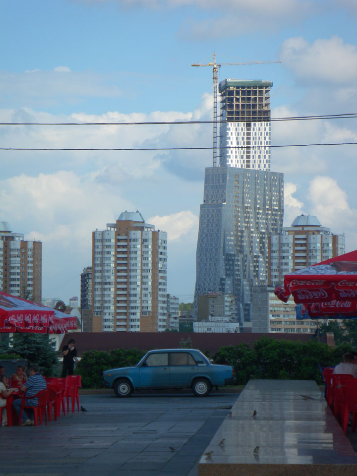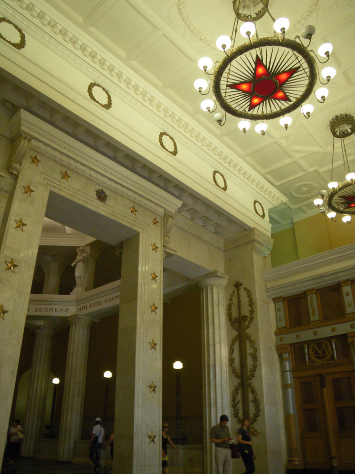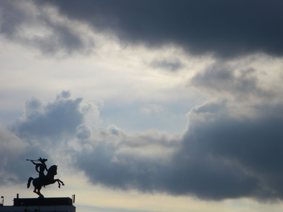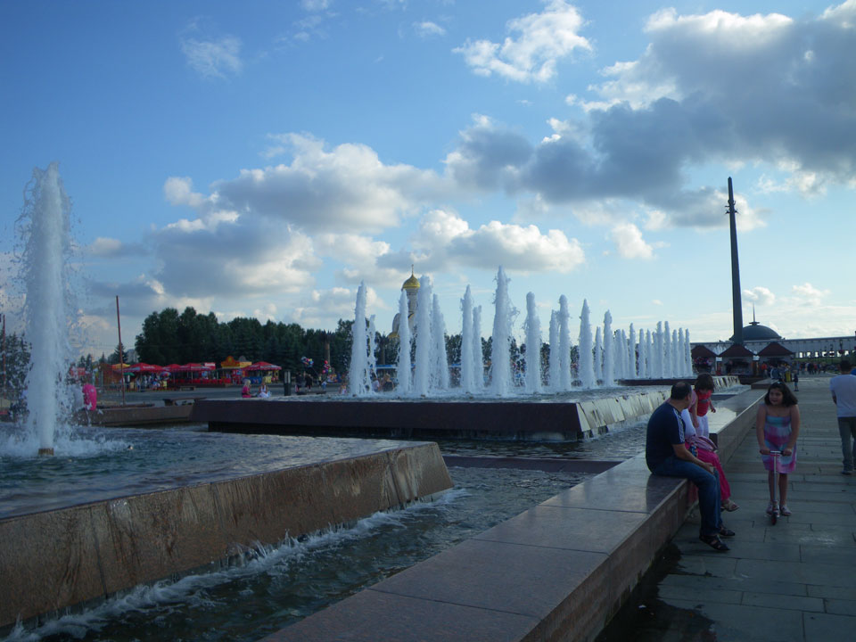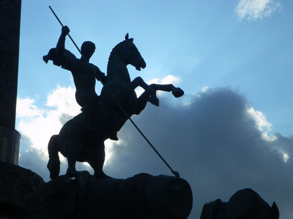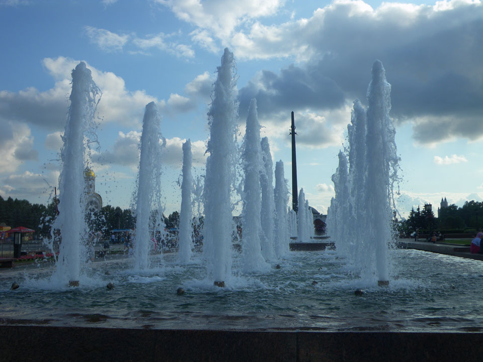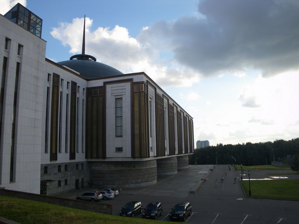 Dort wollte ich gleich mein Ticket für morgen kaufen. Überraschend wenig Leute standen da an und in ca. 20′ hatte ich ein Ticket und noch vie Zeit. So fuhr ich zum Park Pobedy, der mit empfohlen wurde. Dort gab’s eine kostenlose Pepsi, dann stiefelte ich eine Weile rum und verschwand wieder in der Metro, bevor es richtig zu regnen anfing. Die Erinnerung an den zweiten Weltkrieg wird hier an vielen Orten wach gehalten. Ein reiter schlug da in einem Monument ’nem Hakenkreuz-Drachen den Kopf ab.