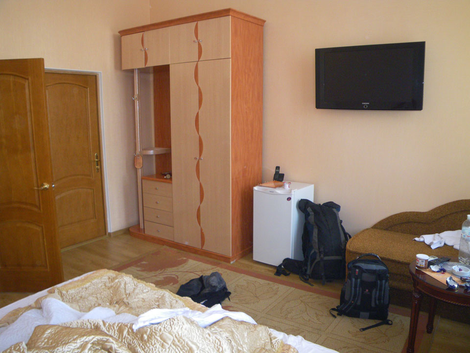 Das erste Taxi wollte 80 UAH, ich wolte 50 zahlen und knallte die Tür zu. Das bereute ich, denn ich vergaß, dass die Marshrutka Station tatsächlich am anderen Ende der Stadt zum Lybid ist. Ich zahlte beim nächsten Fahrer die 80 und war dann im Hotel.