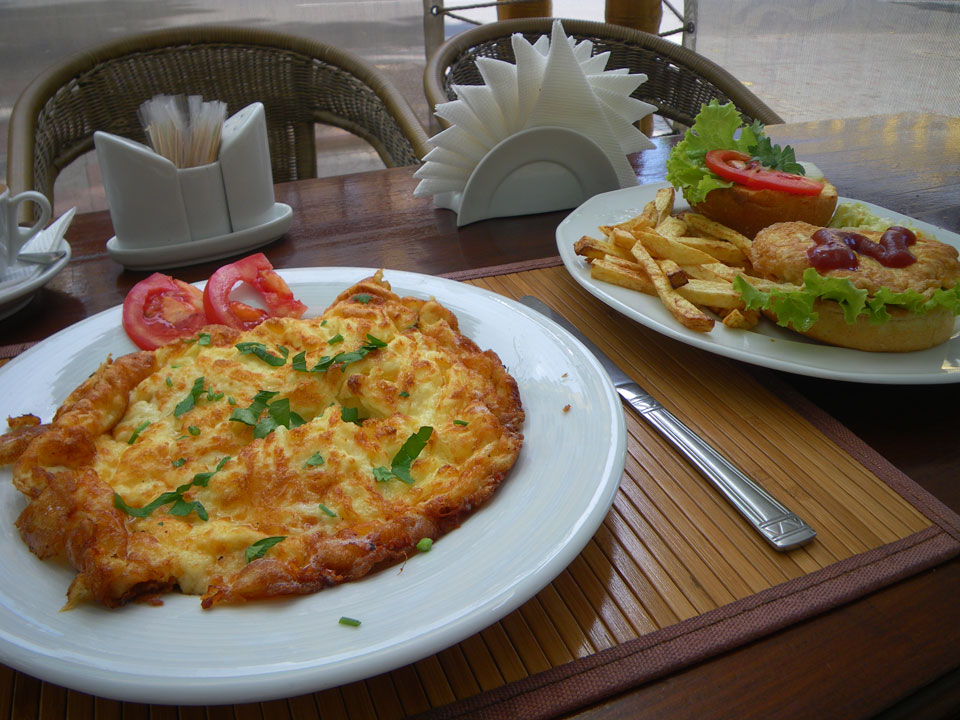 Pünktlich raus und dann suchte ich erst Mal was zum Frühstücken. Das Frühstück wurde dann auch gigantisch mit Omelette und „Gamburger“ statt Schoko-Kuchen. Ein Taxi fand ich aber dann gar nicht.