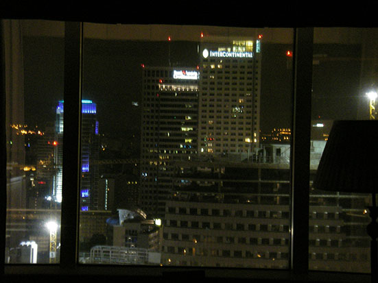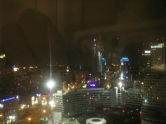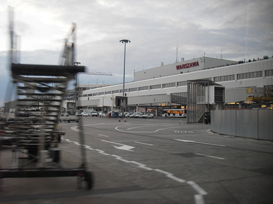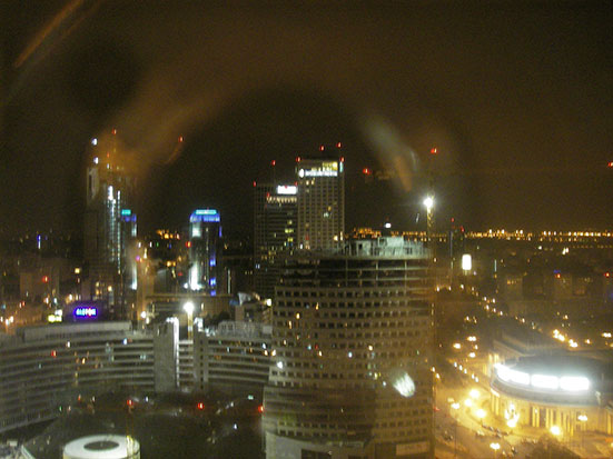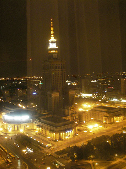 Landung bei Sonnenuntergang, fixe Passkontrolle. Ich sehe wohl auch wieder polnisch aus und werde öfters mit ’nem Haufen „tzschzizschs“ angesprochen. Fühle mich dennoch viel wohler als in Moskau. Rein ins Taxi, großes Hotel gefunde kleines Geld aber nicht dabei. Da musste erst der Türhalter herbeigepfiffen werden, damit man mir wenigstens meine 50 Zloto schein wechselte. Die Fahrt kostete 24 Zl, das sind also €6 (alls durch 4) – 30 bekam der Chauffeur, auch kein Klimpergeld auf Vorrat. Eincheck auch nett, das Zimmer im 32. Stock sehr cool.