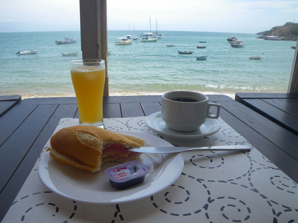 Frühstück in der Bar mit der schönen Aussicht, an die ich mich gewöhnen kann. Das Meeresrauschen ist immer dabei.