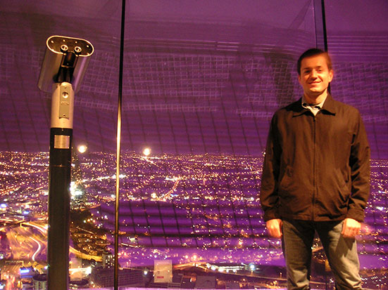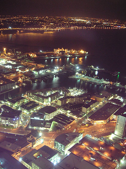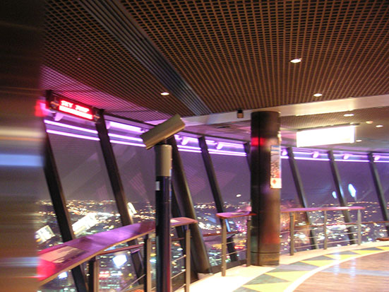 Oben angekommen war die Aussicht super! Die Stadt hatte alle Lichter an, man sah den Hafen und man konnte ganz weit schauen. Per Joystick durfte man auch ein paar Video-Kameras steuern, zoomen und so alles ganz genau sehen.