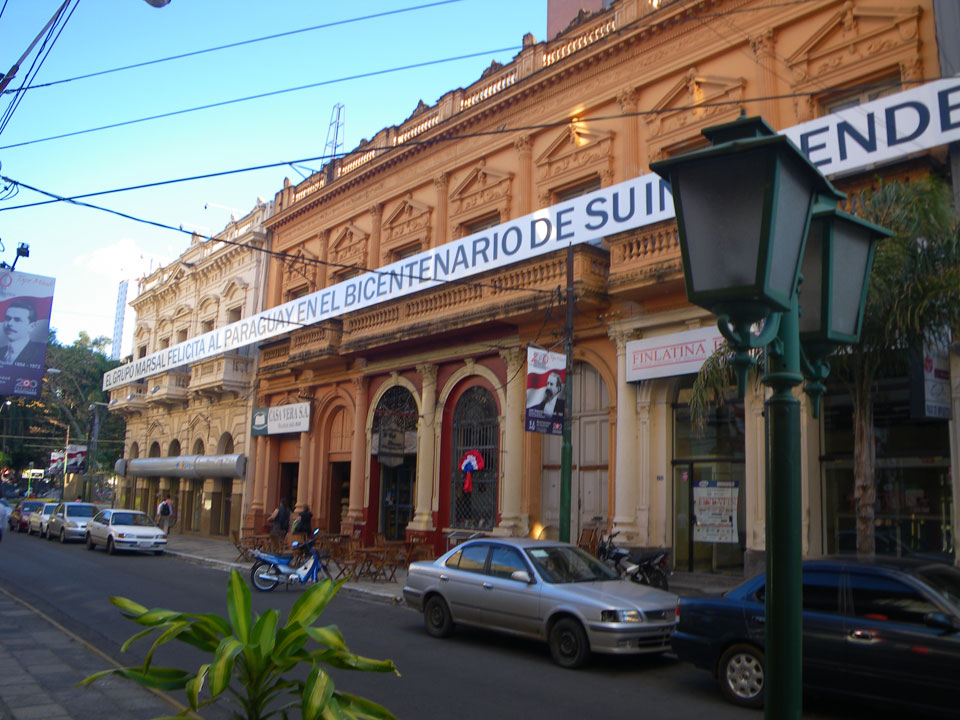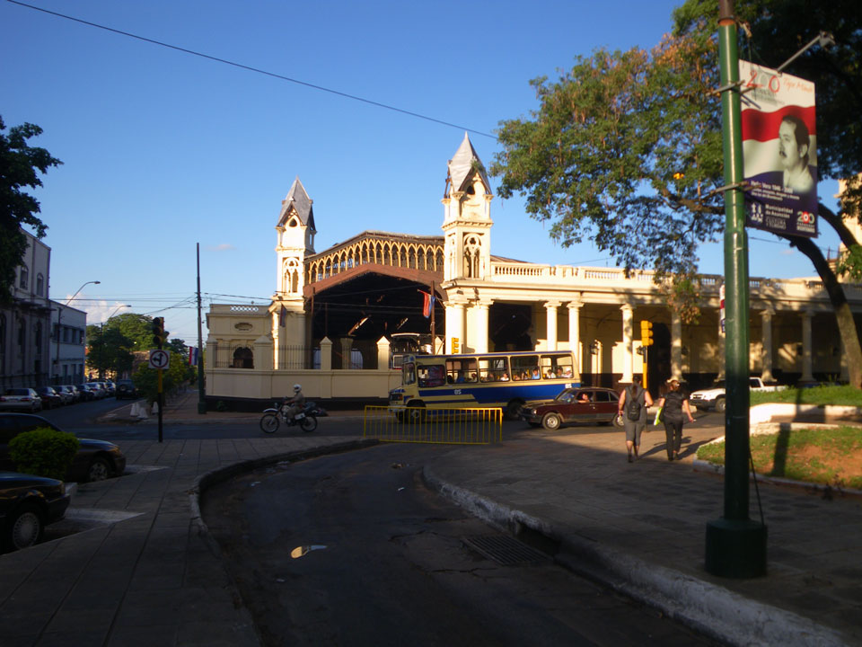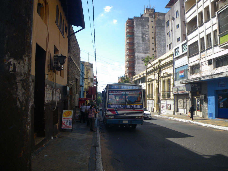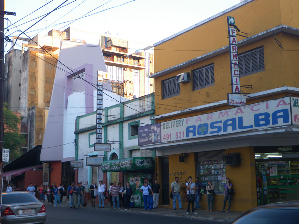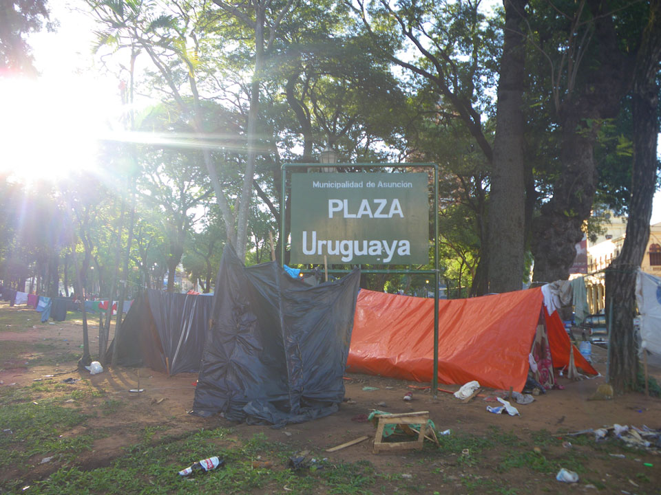 So checkte ich einige Straßen mit vielen Geschäften, kam auch zum unspektakulärem „Casa de la Independencia“. Der Uruguaya Platz schien von Indios besetzt. Viele Behelfs-Zelte aus Plastikplanen, Banner, Wäsche auf Leinen dazwischen und Piss-Geruch. In Paraguay läuft eben auch nicht alles glatt. Die Gegensätze sind manchmal stark sichtbar – meistens sieht es aber einfach nur ärmlich aus. Ich kann bisher ganz gut untertauchen, knipse mit der Pentax vor mich hin und war vor der Dunkelheit wieder im Hotel.