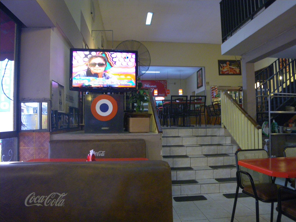 Wieder gegen 16:00 war ich draußen – Hitze. Die Schwüle bringt den Schweiß auf die Stirn. Im heftig klimatisierten „Bigger“ Café hatte ich ’nen Burger, Doppelten Cortado und Melonen-Saft – PYG 32.500.