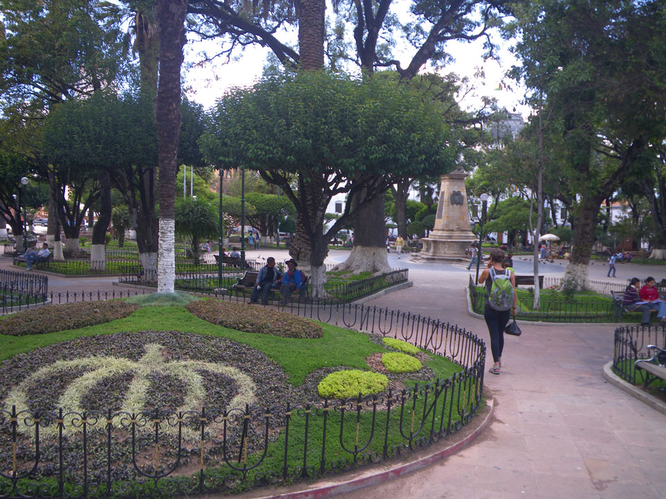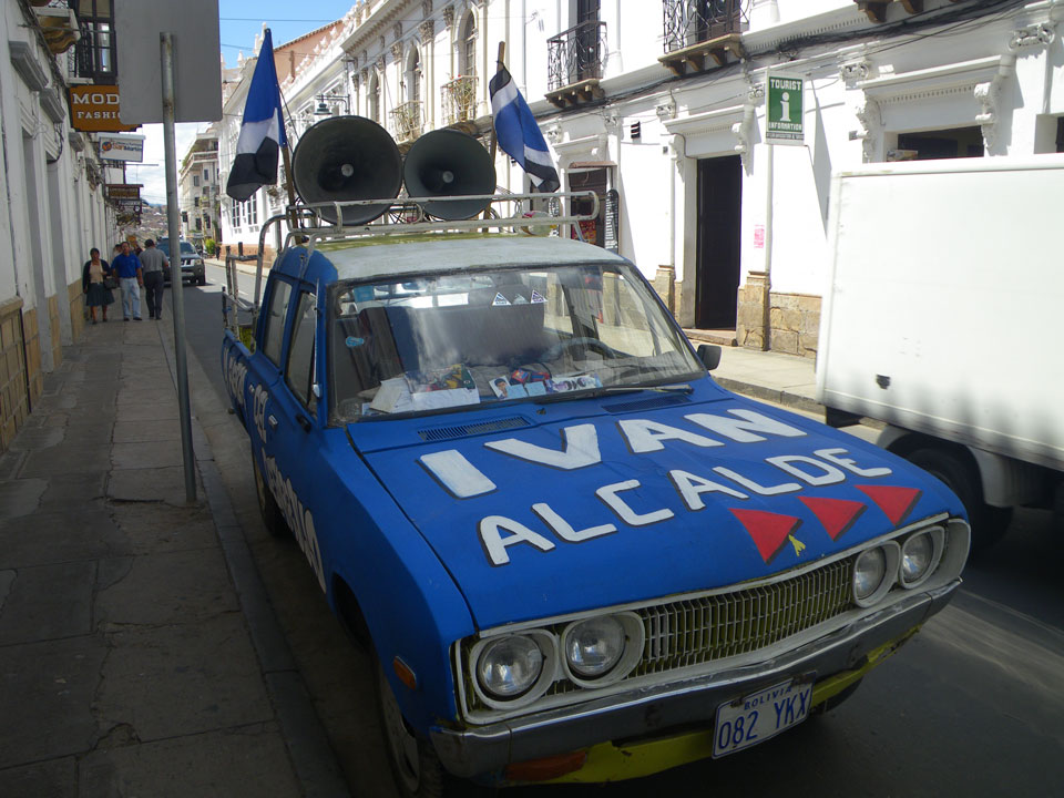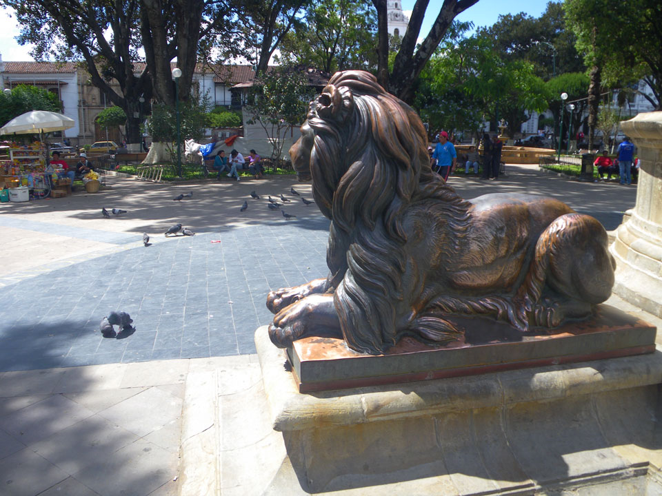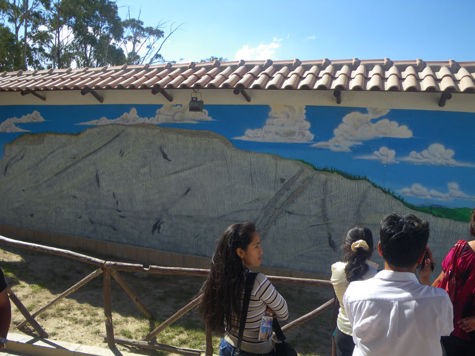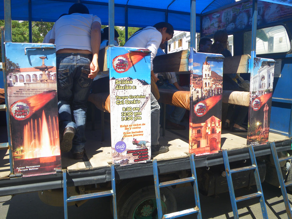 Mit dem langsamen Internet machte ich Schluss und ging 14:00 zum 25 Mayo Platz für die Dinosaurier-Tour. Hier in Sucre gibt es Fußabdrücke von Dinos, die auf einem halb-trockenen Seeboden verewigt wurden. Durch die Tektonik ist das jetzt eine Wand und das wollte ich sehen.