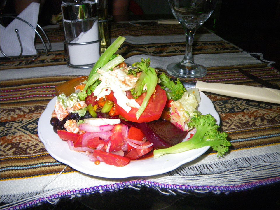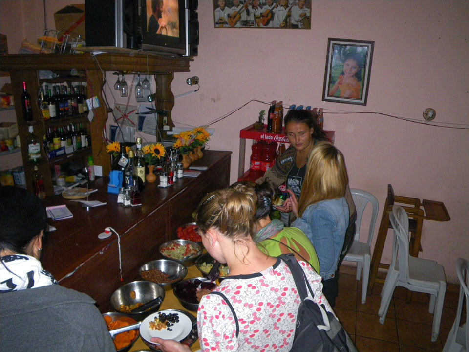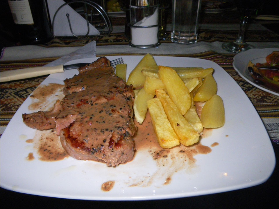 Wieder zurück in die Stadt, Wäsche holen, war noch nicht fertig, Cappucchino und Empanada-Snack zum Zeitvertreib und später dann wurde ich abgeholt. Das beste Hostel der Stadt (Gringo’s) ist voll aber die Leuet sind nett und gingen in ein Steak-House essen. Dort gab’s eine gute Salatbar und dann bekam ich ein geniales Steak mit Pfeffer. Zusammen mit Rotwein kam jeder auf ca. 50 Bs – also €5-6.