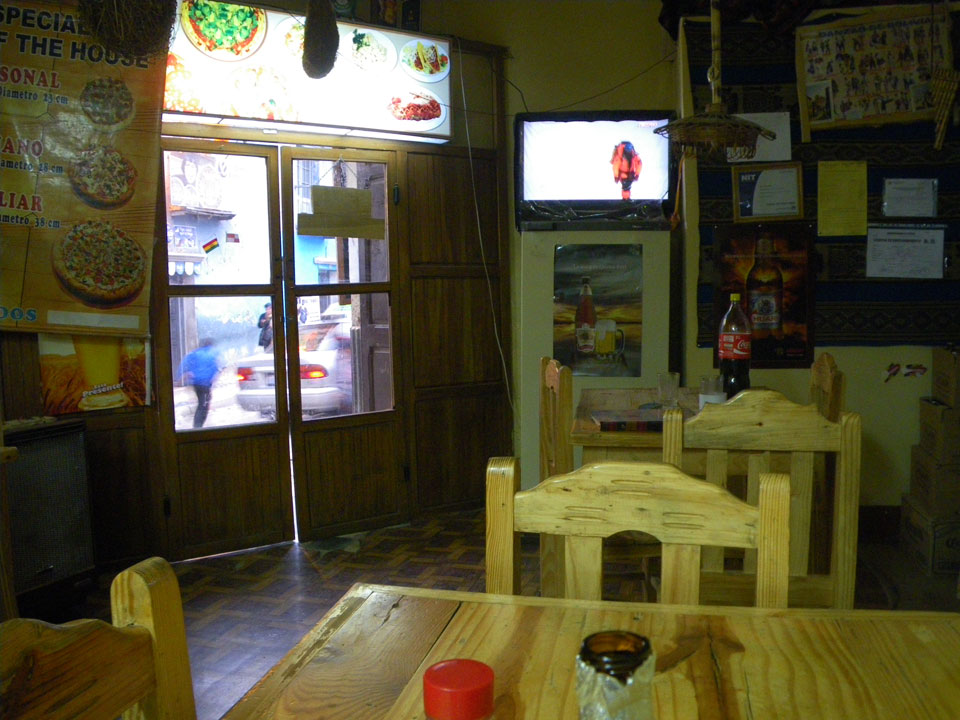 Guddi, ein Streifzug durch die Straßen. Etwas schwindlich setzte ich mich in ein Restaurant. Die hatten gar nichts außer Pizza, was aber auch OK war. Wie in Asien, keine Servietten sondern Klopapier als Ersatz. Ein kleines Bier und dann mit 62 B Zahlung wieder nach Hause. Etwas Regen startete und wurde stärker. Gut, dass der Innenhof des Hostals überdacht ist.