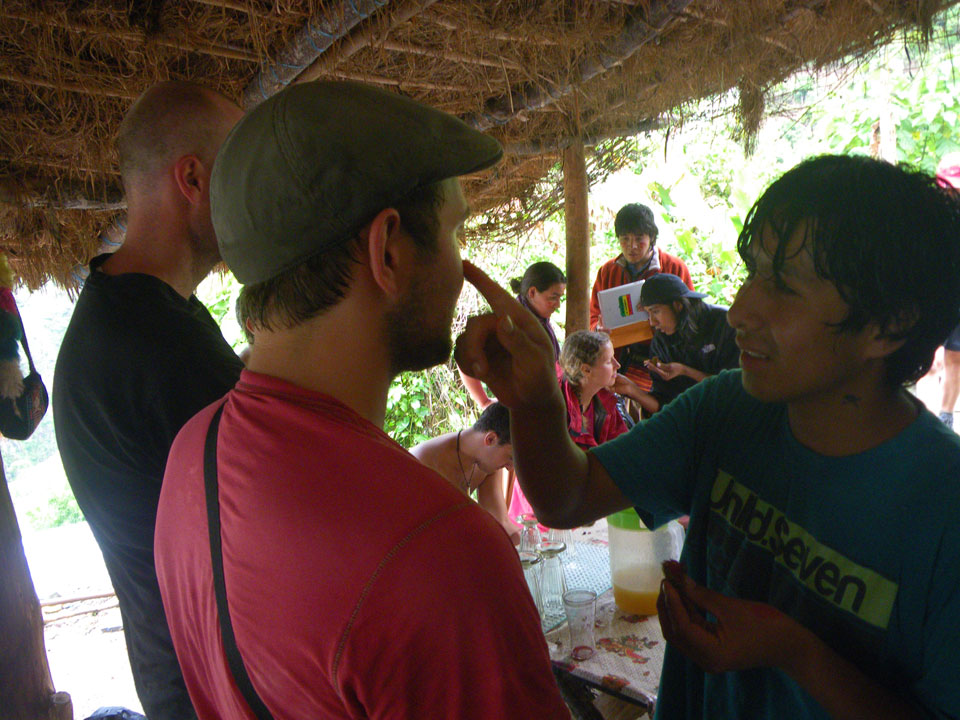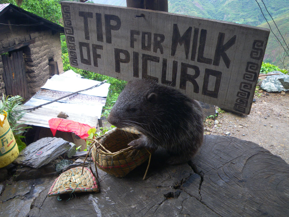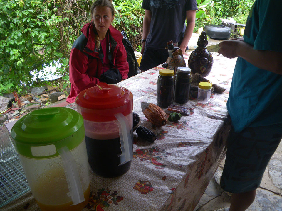 So ist das auf der Wandertour. Ich hatte Coca-Blätter im Mund und war OK dabei. Wir kamen an Rastplätzen vorbei, wo Tiere, wie ein Affe und irgendein Viech zur Belustigung und Tipps gehalten wurden. Ich hatte Chicha und Maracuja Saft.