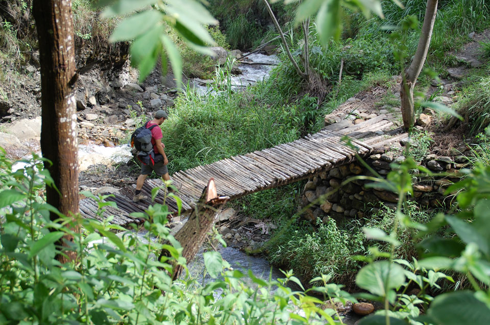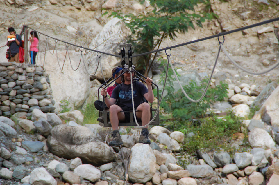 Die Mittagspause nutzte ich für ein Nickerchen (super Avocado-Dip und Spaghetti), dann ging’s weiter. Am Fluss entlang über Bambusbrüclken und das Beste: eine Gondel zur Überquerung mit Handbetrieb.