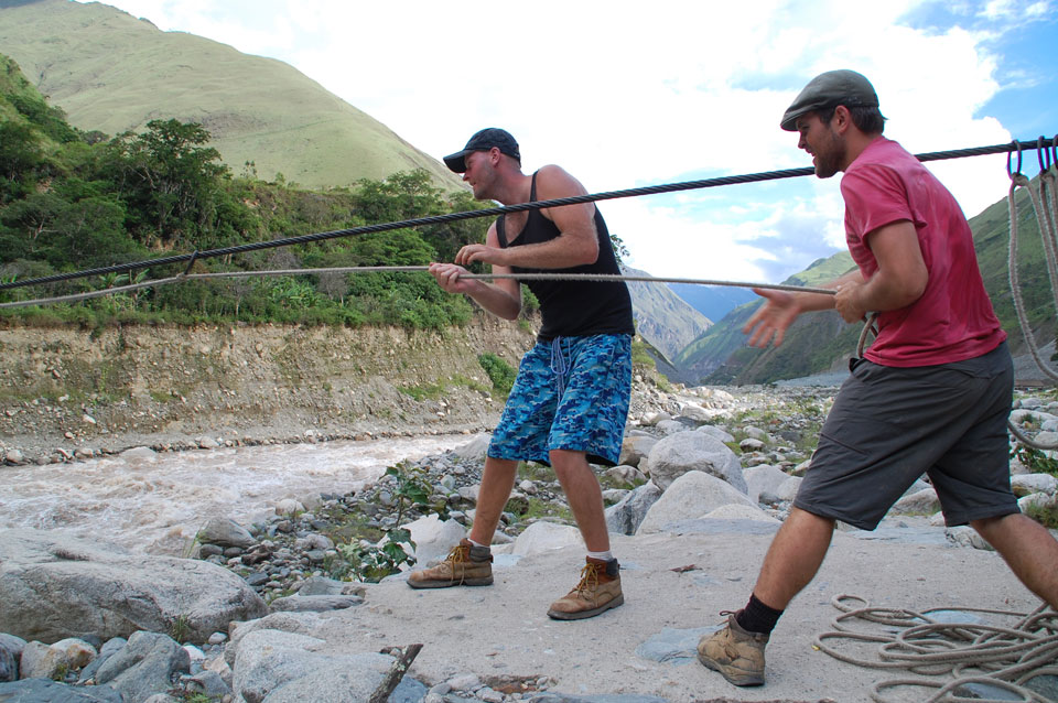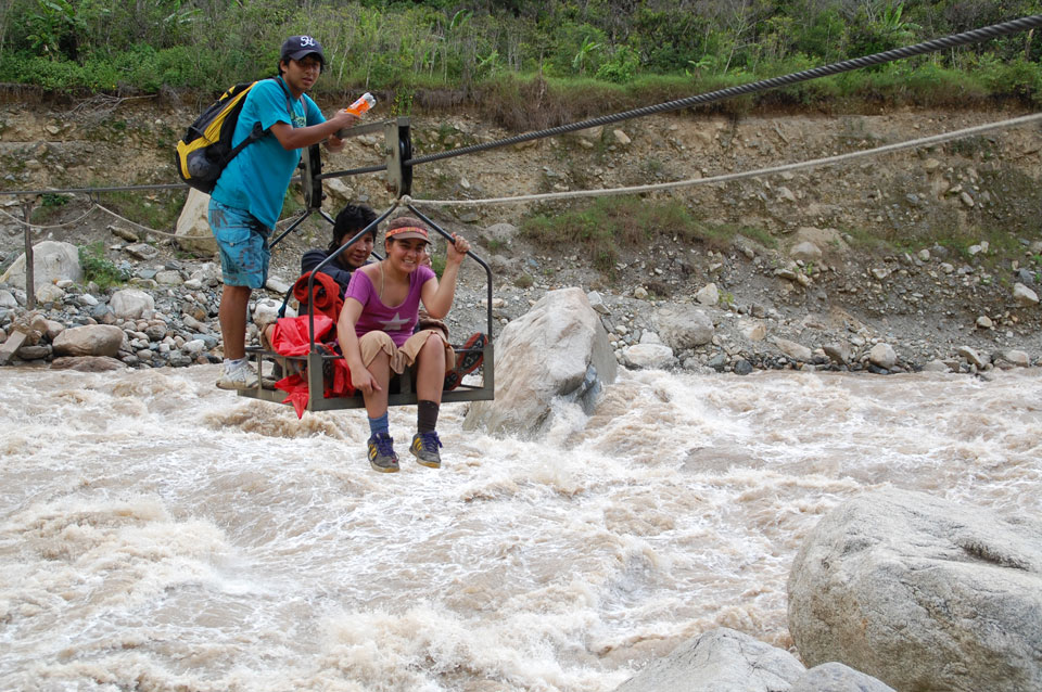 Für einen Soles pro Nase saß man in einer 2 Personen Kiste und wurde vom anderen Ende des Flusses gezogen. Die ersten Leute musste sich selbst ziehen, dann ging’s schneller. Echt cool, unter mir der reißende Fluss und doch sicher am anderen Flussufer.