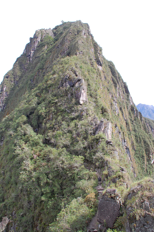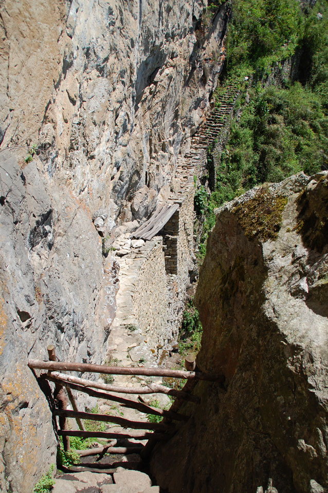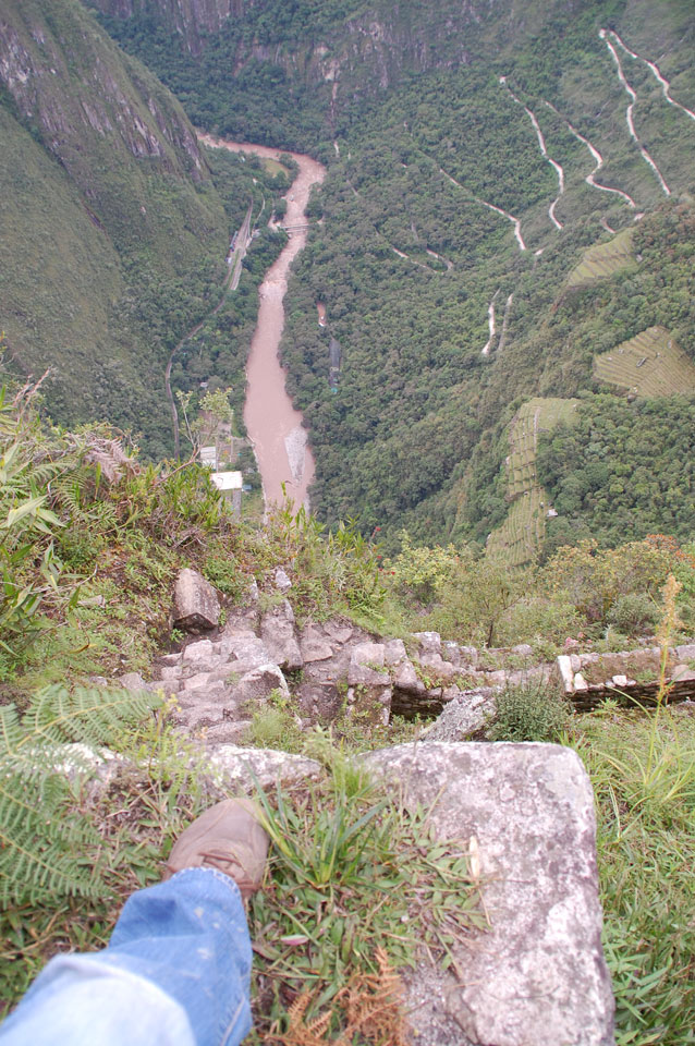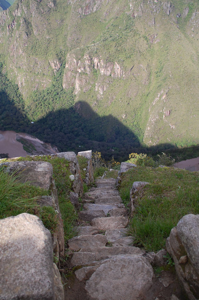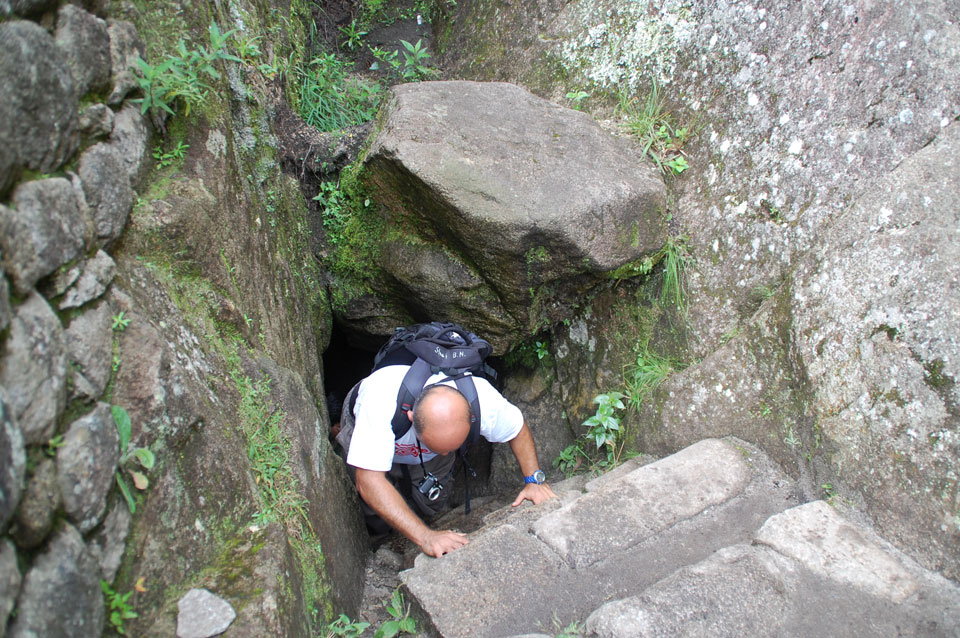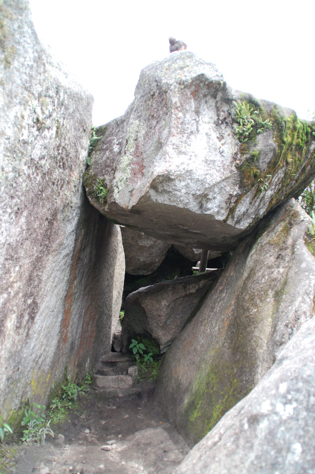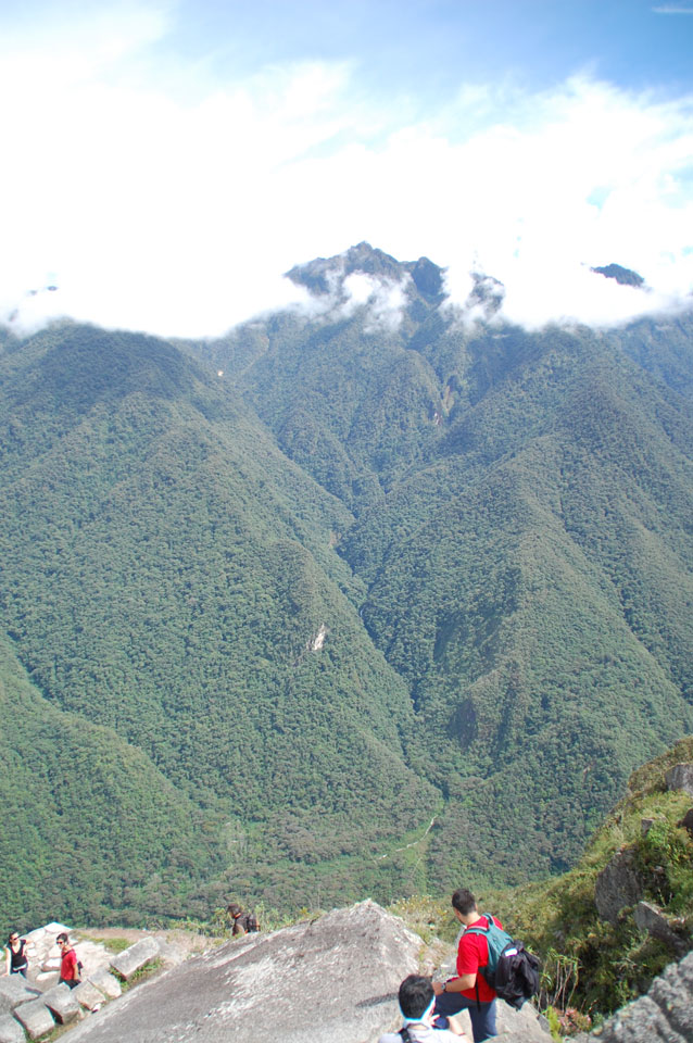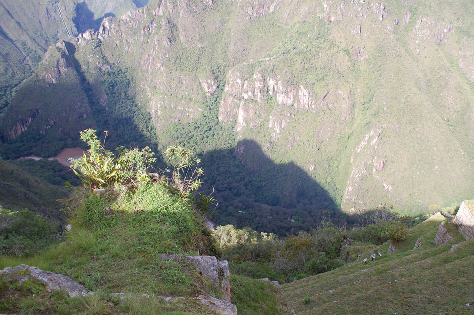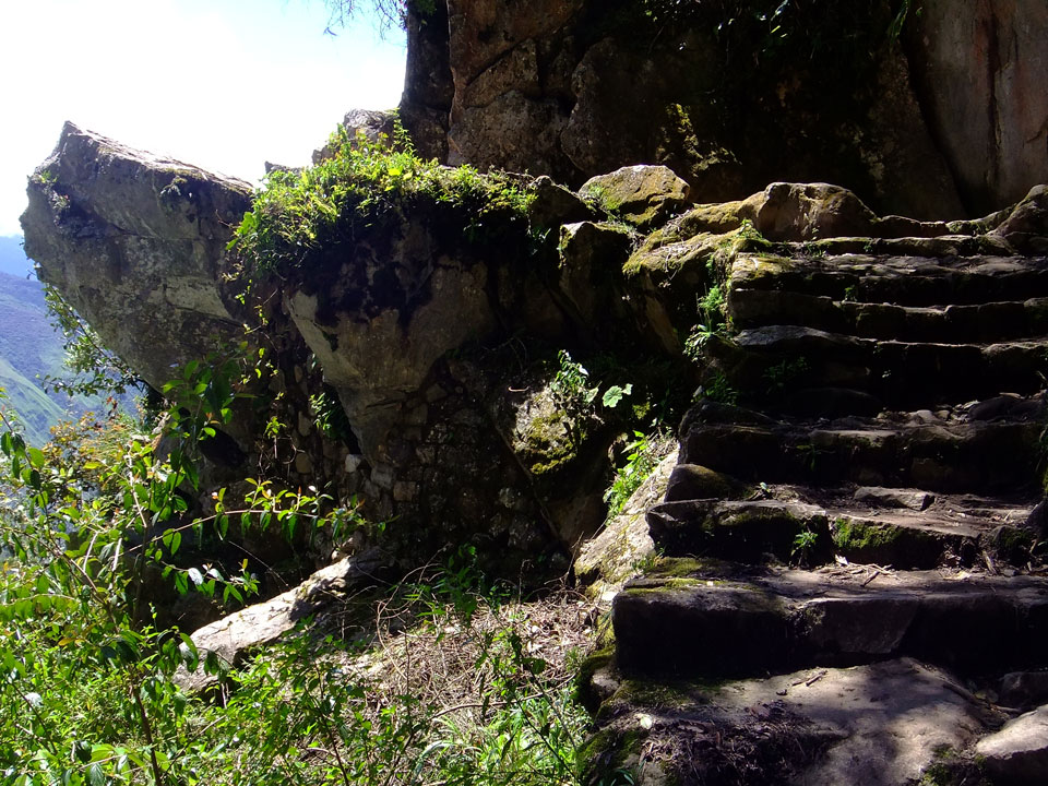 Die Kanadier rauchten einen und ich kletterte herum, entschied mich für den Abstieg zur Gran Caverna. Der sollte lang sein aber einfacher als den gleichen Weg zurück. Es ging steil bergab, sogar mit ’ner Leiter manchmal. Dann unten waren wieder ein paar Höhlen, Ruinen und Steine, wie ein Mondtempel. Wieder hoch staunte ich nicht schlecht, Machu Picchu sollte 1 1/2 Stunden brauchen?! Ich traf die Kanadier, die auch diesen Weg wählten. Jetzt gging’s an die Substanz. Es schien, als kletterten wir wieder ganz hoch. Die Treppen waren endlos, viel Schweiß ließ ich auf diesem Weg.