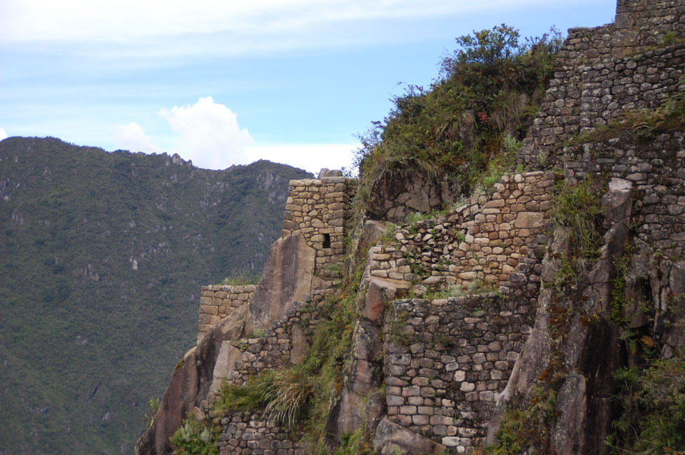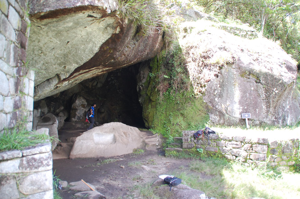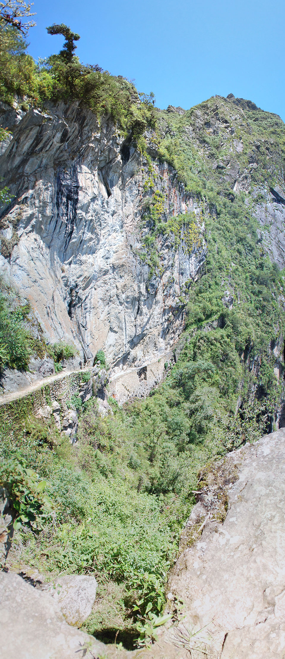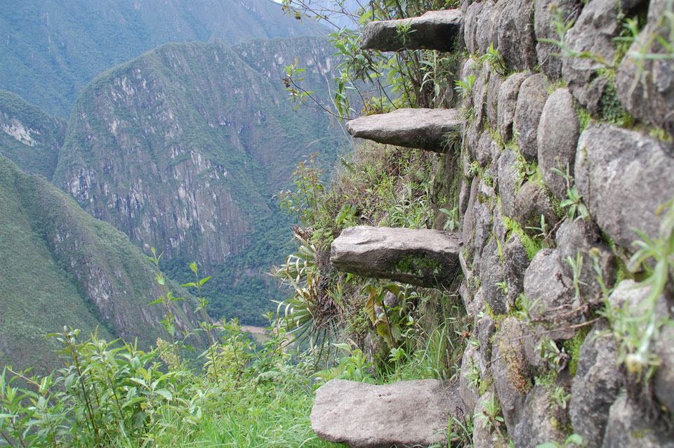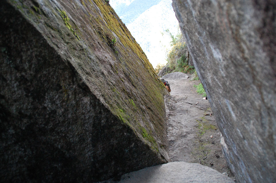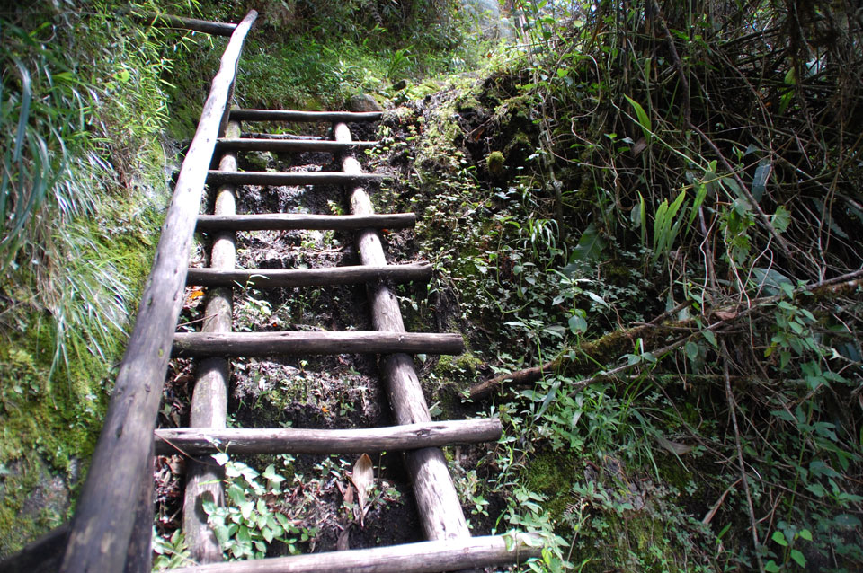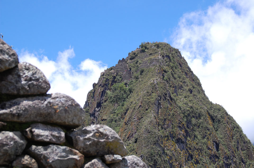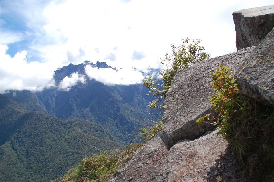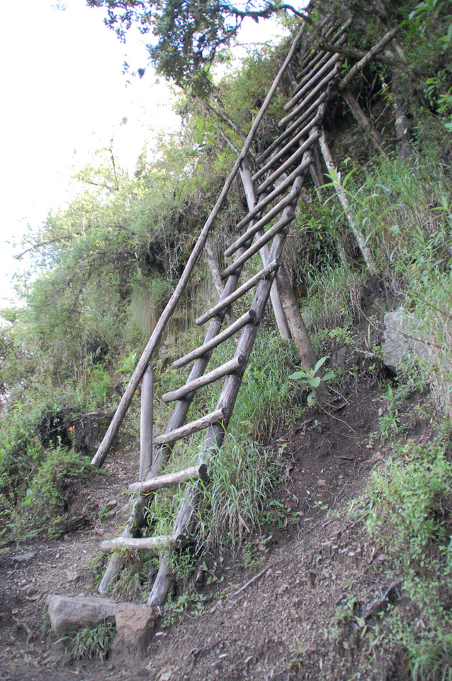 Die Kanadier rauchten einen und ich kletterte herum, entschied mich für den Abstieg zur Gran Caverna. Der sollte lang sein aber einfacher als den gleichen Weg zurück. Es ging steil bergab, sogar mit ’ner Leiter manchmal. Dann unten waren wieder ein paar Höhlen, Ruinen und Steine, wie ein Mondtempel. Wieder hoch staunte ich nicht schlecht, Machu Picchu sollte 1 1/2 Stunden brauchen?! Ich traf die Kanadier, die auch diesen Weg wählten. Jetzt gging’s an die Substanz. Es schien, als kletterten wir wieder ganz hoch. Die Treppen waren endlos, viel Schweiß ließ ich auf diesem Weg.