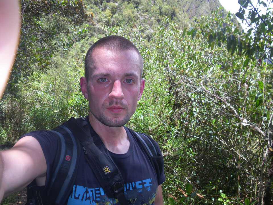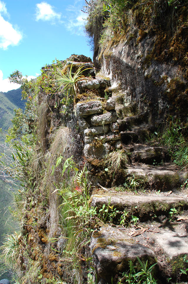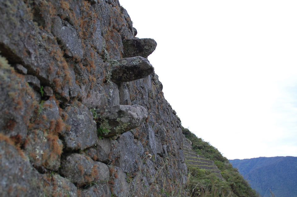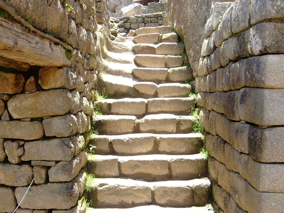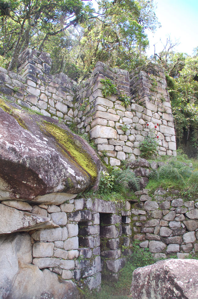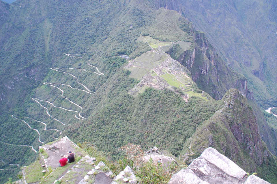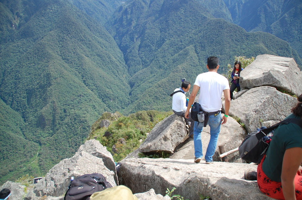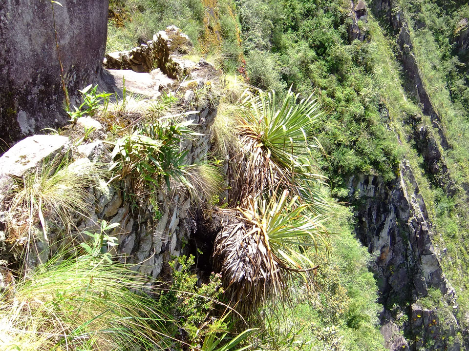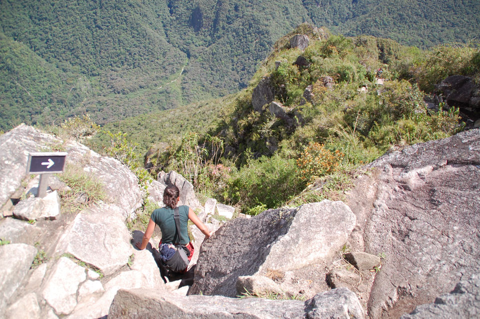 Die Kanadier rauchten einen und ich kletterte herum, entschied mich für den Abstieg zur Gran Caverna. Der sollte lang sein aber einfacher als den gleichen Weg zurück. Es ging steil bergab, sogar mit ’ner Leiter manchmal. Dann unten waren wieder ein paar Höhlen, Ruinen und Steine, wie ein Mondtempel. Wieder hoch staunte ich nicht schlecht, Machu Picchu sollte 1 1/2 Stunden brauchen?! Ich traf die Kanadier, die auch diesen Weg wählten. Jetzt gging’s an die Substanz. Es schien, als kletterten wir wieder ganz hoch. Die Treppen waren endlos, viel Schweiß ließ ich auf diesem Weg.