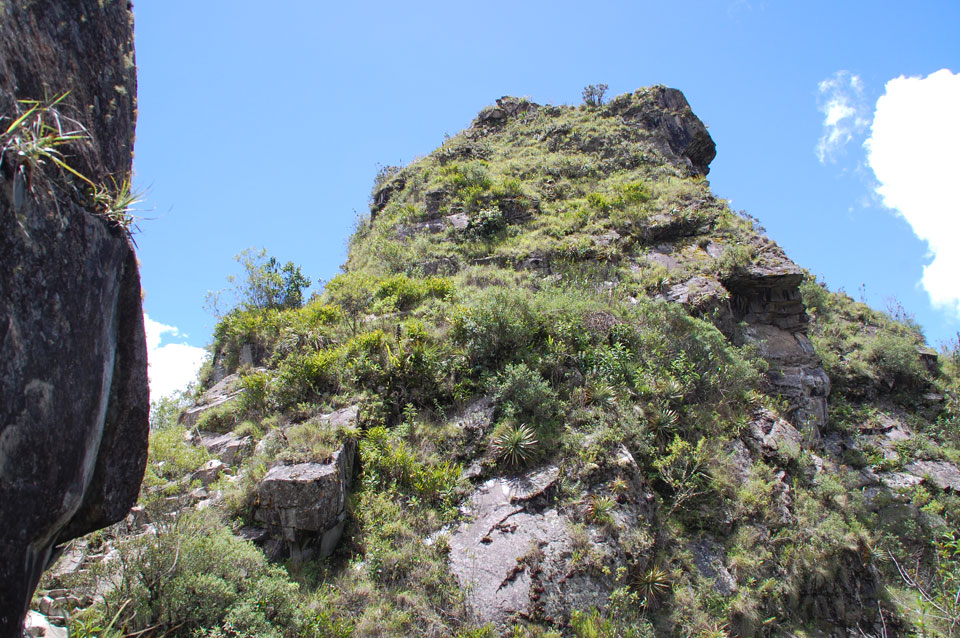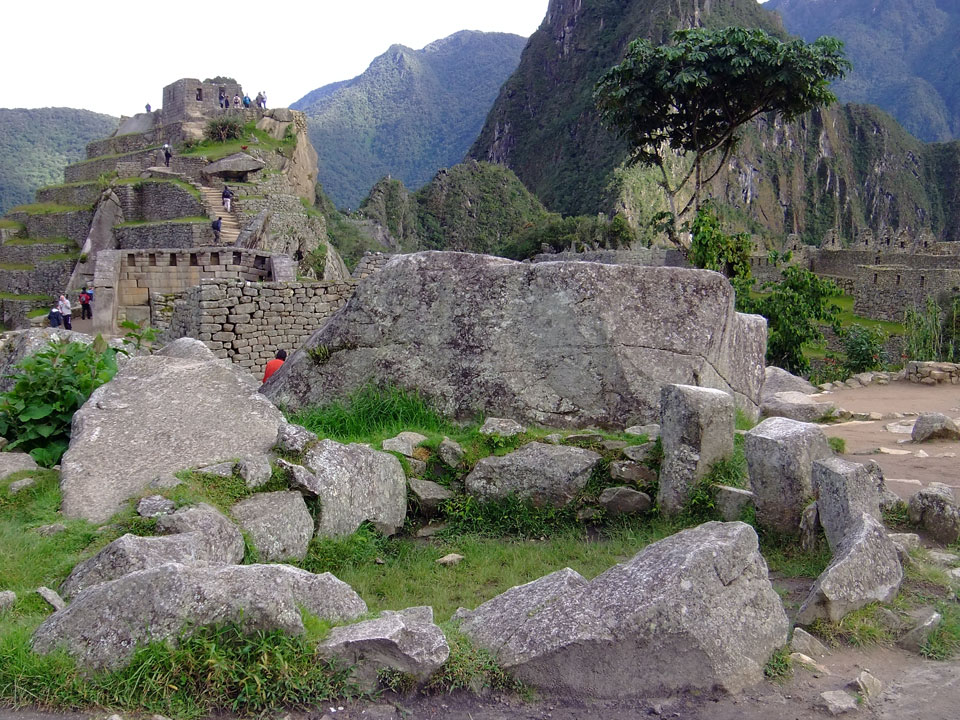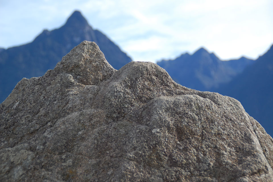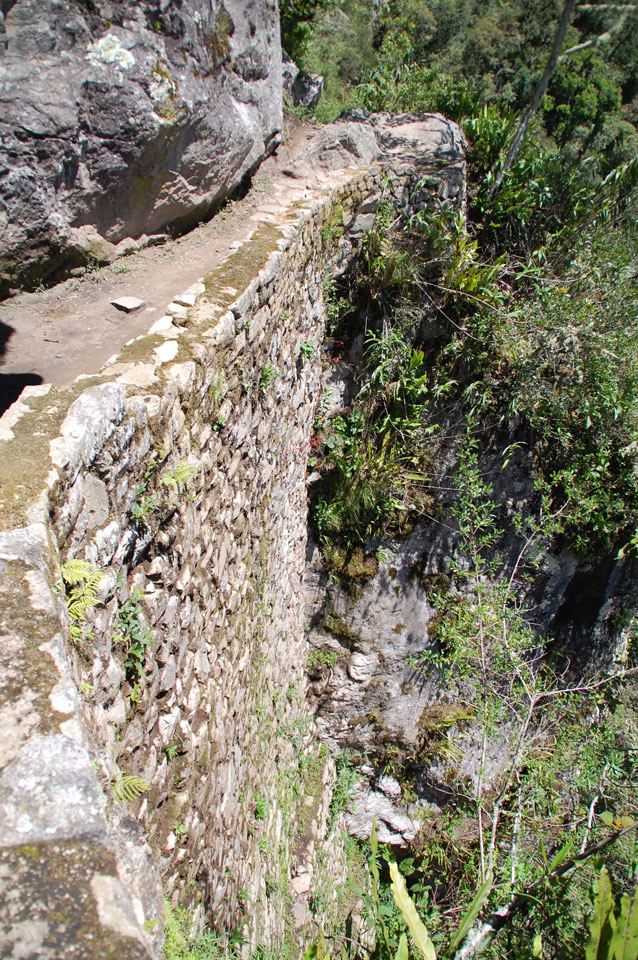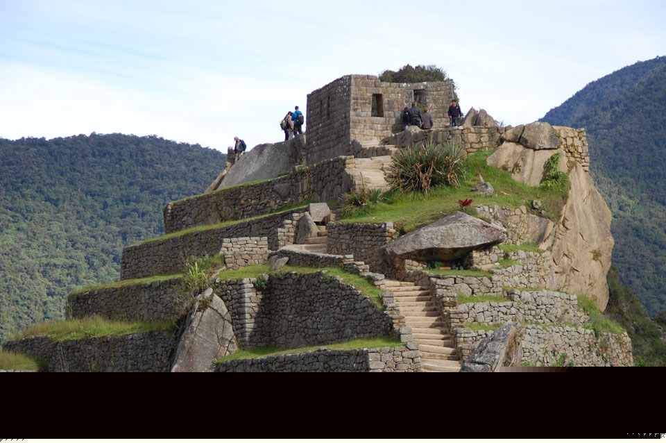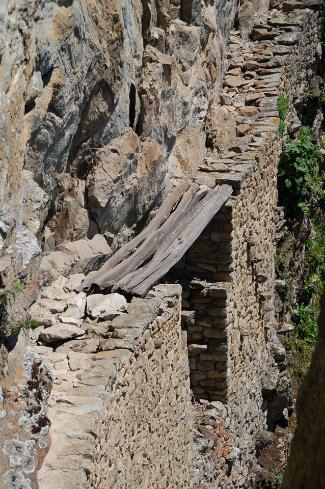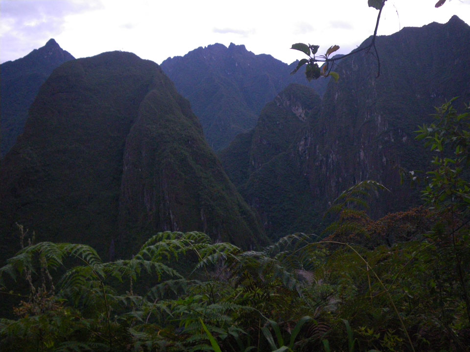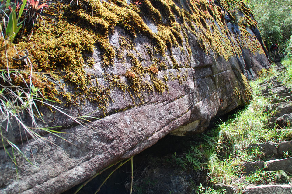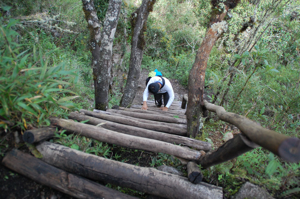 Die Kanadier rauchten einen und ich kletterte herum, entschied mich für den Abstieg zur Gran Caverna. Der sollte lang sein aber einfacher als den gleichen Weg zurück. Es ging steil bergab, sogar mit ’ner Leiter manchmal. Dann unten waren wieder ein paar Höhlen, Ruinen und Steine, wie ein Mondtempel. Wieder hoch staunte ich nicht schlecht, Machu Picchu sollte 1 1/2 Stunden brauchen?! Ich traf die Kanadier, die auch diesen Weg wählten. Jetzt gging’s an die Substanz. Es schien, als kletterten wir wieder ganz hoch. Die Treppen waren endlos, viel Schweiß ließ ich auf diesem Weg.