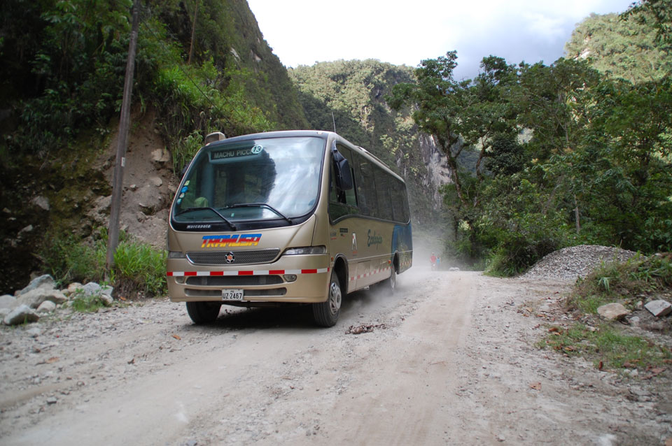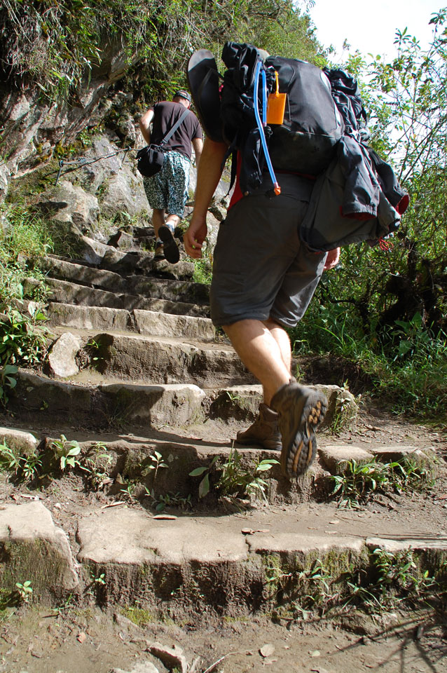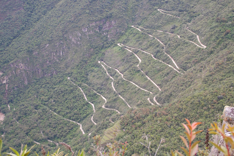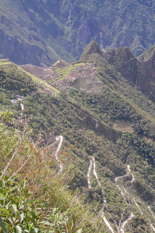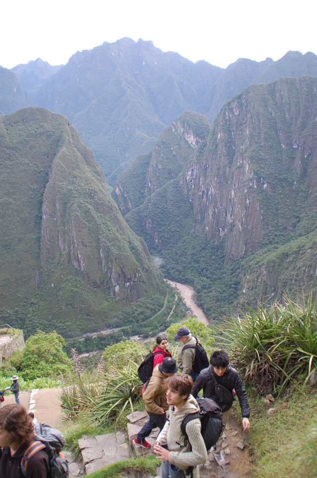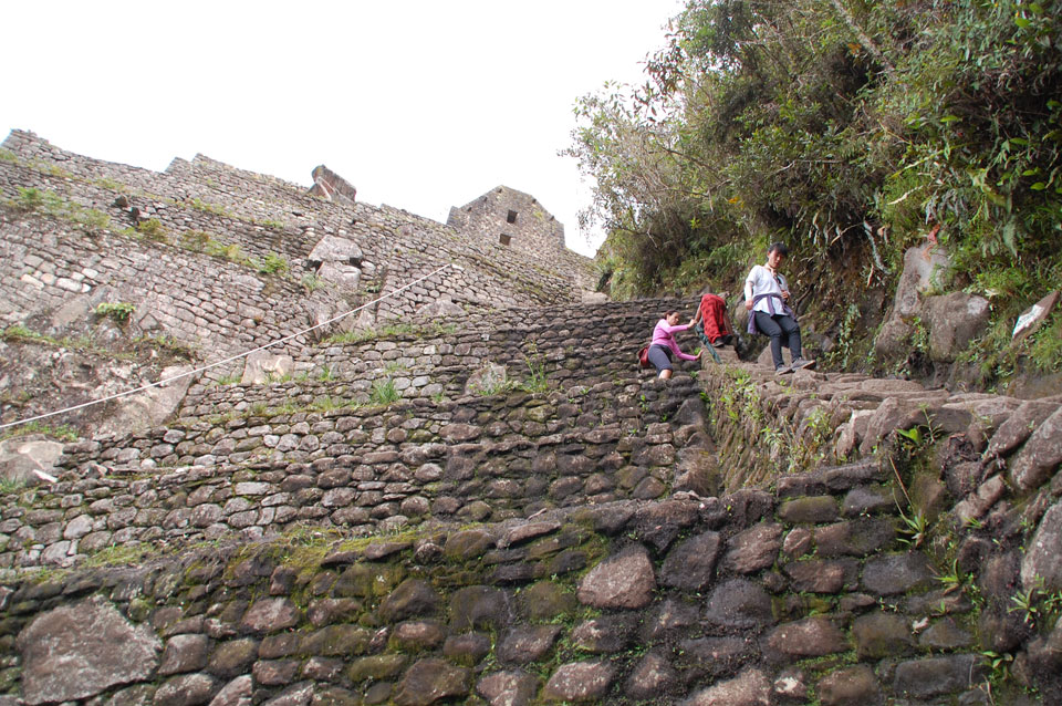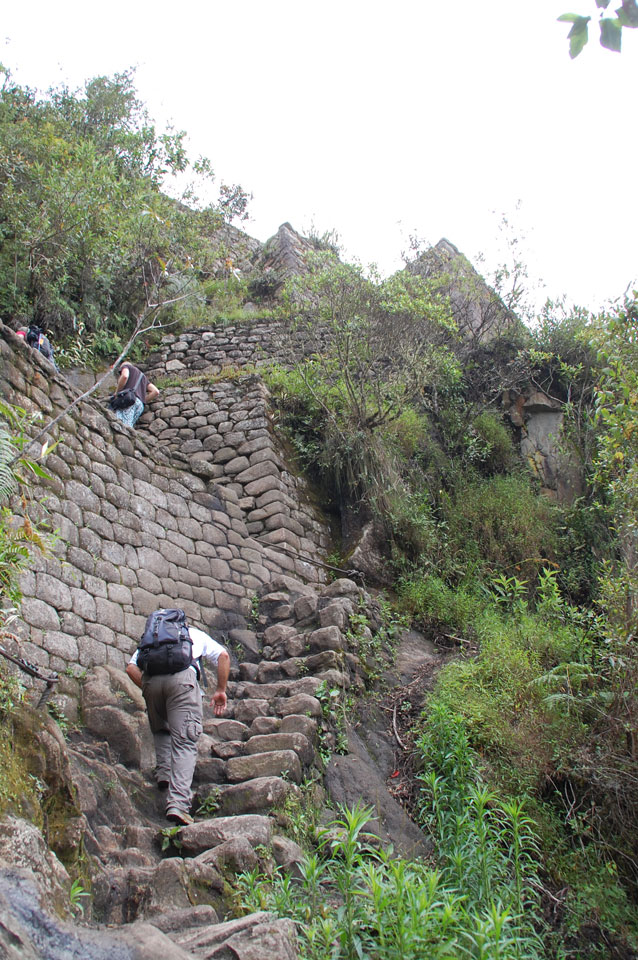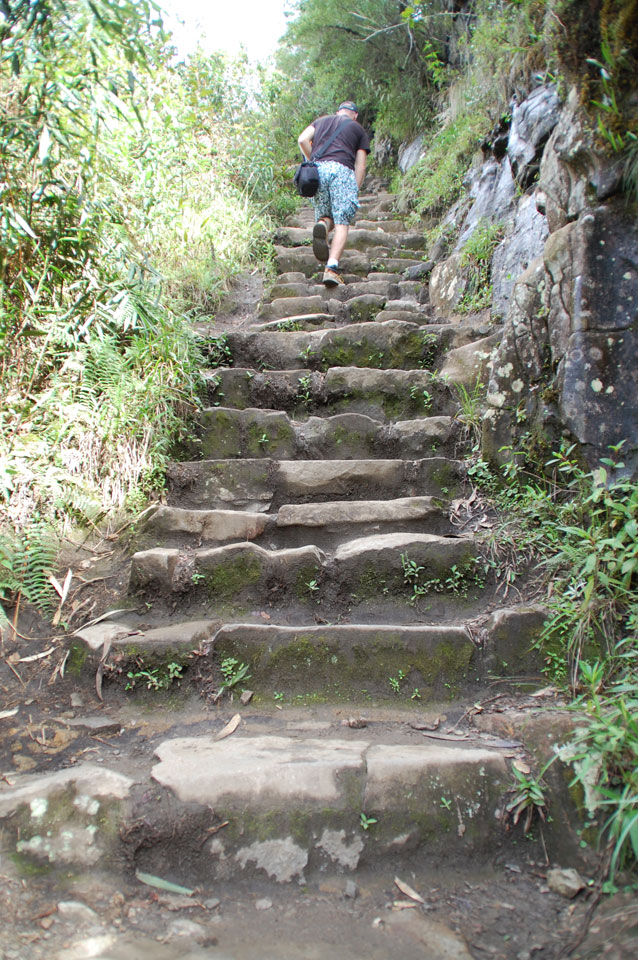Der Aufstieg zu Machu Picchu kann per Bus oder Treppensteigen bewältigt werden. Wir nahmen die Treppen und das ware einige. Ich verpasste wegen Photos und trinken den Anschluss, landete auf der Busstraße, die man ab un zu überqueren muss. Nach ein paar Minuten bemerkte ich meinen Irrtum, die Treppen kamen nicht wieder. So joggte ich zurück und fand die Treppen wieder.