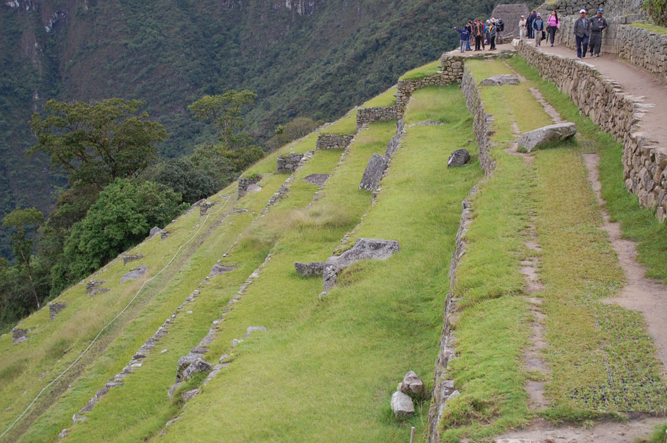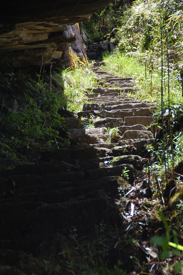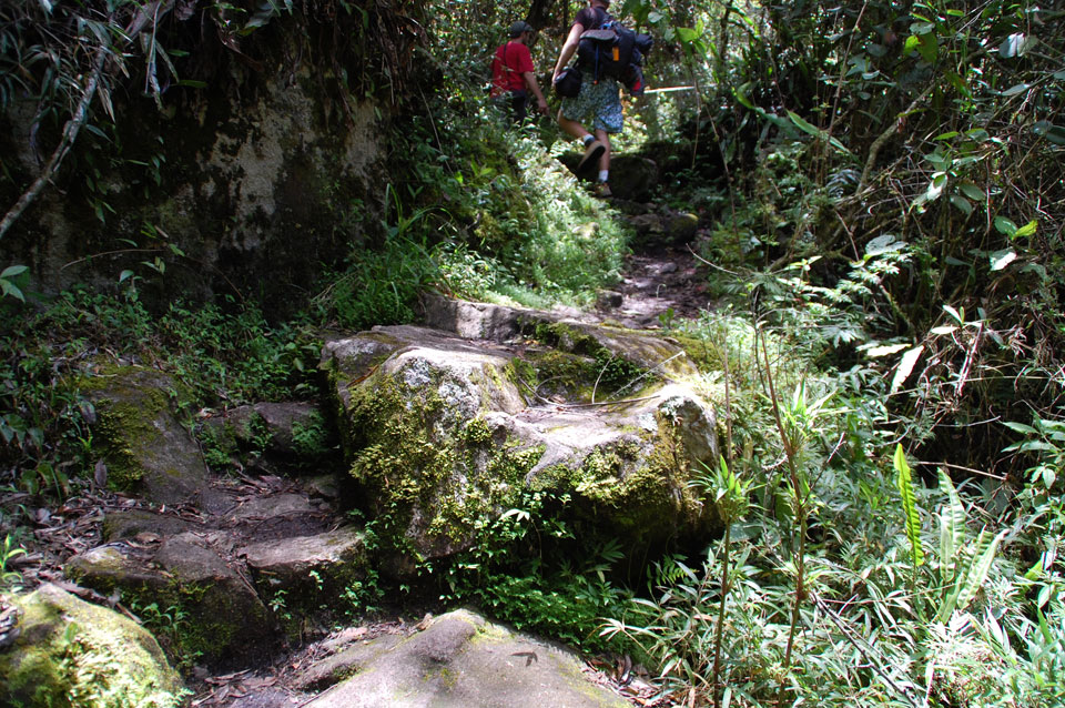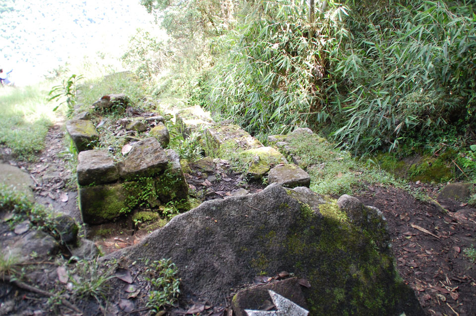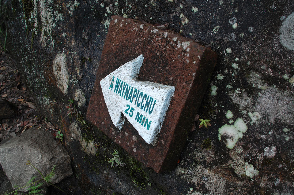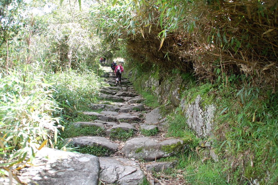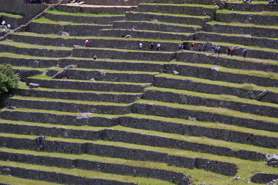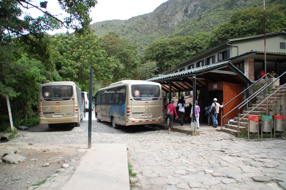 Der Aufstieg zu Machu Picchu kann per Bus oder Treppensteigen bewältigt werden. Wir nahmen die Treppen und das ware einige. Ich verpasste wegen Photos und trinken den Anschluss, landete auf der Busstraße, die man ab un zu überqueren muss. Nach ein paar Minuten bemerkte ich meinen Irrtum, die Treppen kamen nicht wieder. So joggte ich zurück und fand die Treppen wieder.