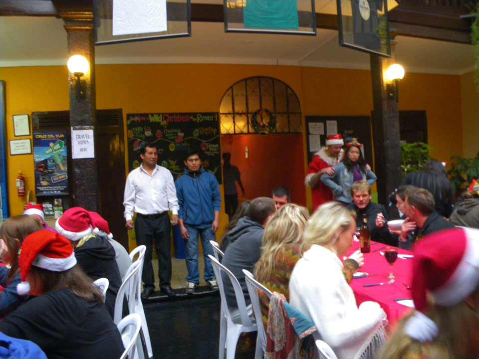 Das Weihnachtsessen begann gegen 5 (50 PEN = €14,50) und das ganze Hostel schien dabei zu sein. Ich saß mit den Amerikanern aus dem Zimmer, schätze ein Alter als zu hoch, redete aber viel und aß noch mehr. Es gab Suppe, viel Fleisch und dann noch Apfelkuchen mit Eis als Dessert. Mit Wein rutschte alles in meinen großen Magen und ich war zufrieden. Viele aßen nicht auf – ich nahm sogar noch ein paar Happen von anderen Tellern. So war ich satt und zufrieden, redete dann etwas in der Bar aber war eben auch viel am Computer. Ab und zu gibt’s gute Geschichten zu Erlebnissen in Ecuador von ’nem Deutschen. Ich hatte ’nen Doppelten Rum&Coke für nur 6 PEN und damit genug.