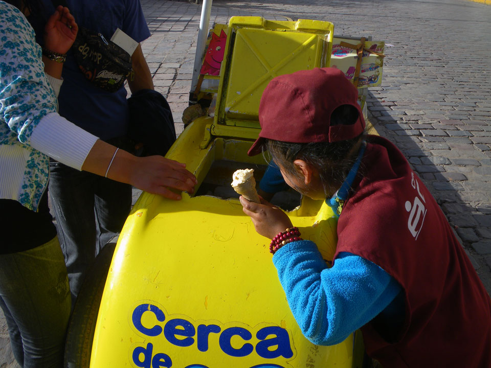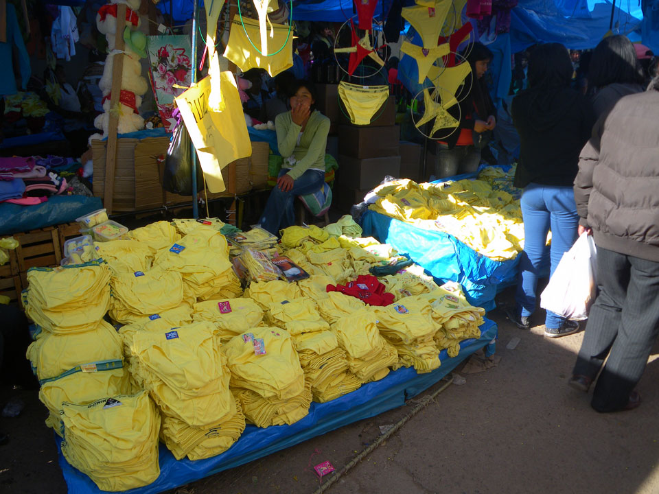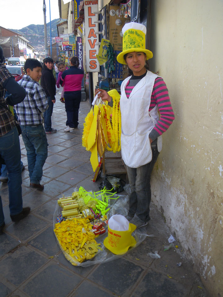 Früh das erste Frühstück, dann Schlaf nachholen, dann das zweite Frühstück und Treffen. Tingeltangeltour durch die Straßen. Zum Neujahr gibt’s in Peru ein paar lustige Traditionen, in denen die Farbe Gelb eine große Rolle spielt.