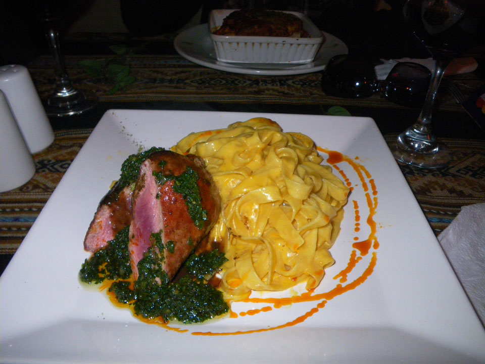 Die Runde durch die Stadt war nett – alles auf den Beinen für die Neujahrsvorbereitungen. In den Gassen fanden wir das „two nations“ Restaurant. Ein Australier mit Peruanischer Frau betreibt ein kleines Restaurant mit Fusion Küche. Ich hatte ein Alpaca Steak mit Linguini. Das hausgebrauhte Bier war gerade aus – der Wein war OK. Das Dessert war nicht mehr drin, die Küche brauchte noch 40′ für die restlichen Gäste. Gestern schmeckte es besser, Alpaca war wieder gut.