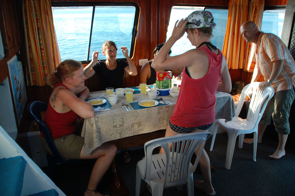 So war die Tour nach einem langsamen Start doch das Warten auf’s Frühstück wert. Danach bummelte ich etwas, duschte mich und es kam der Aufruf zum Aufbruch. Was?! Ich hatte bei Weitem noch nicht fertig gepackt und war nun voll im Stress. Das Boot legte schließlich ohne mich ab, da ich mit 15′ mehr Zeit gerechnet hatte. Es war nun 9:00 – mein Flieger erst 12:35. Genug Zeit und die Crew machte nun auch keinen Stress. Irgendwann wurde ich an Land gebracht, eine halbe Stunde später kam der nächste Bus und ich hatte dann viel Zeit auf dem Flughafen. Ich traf ein paar Leute, aß und trank und verplapperte die Zeit.