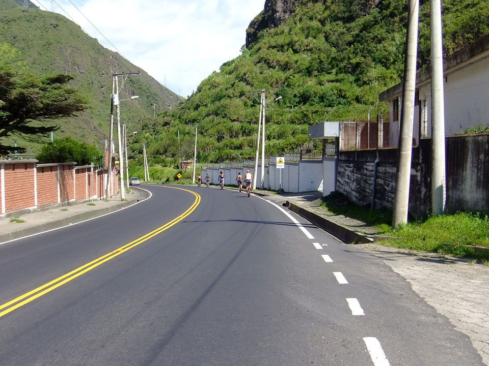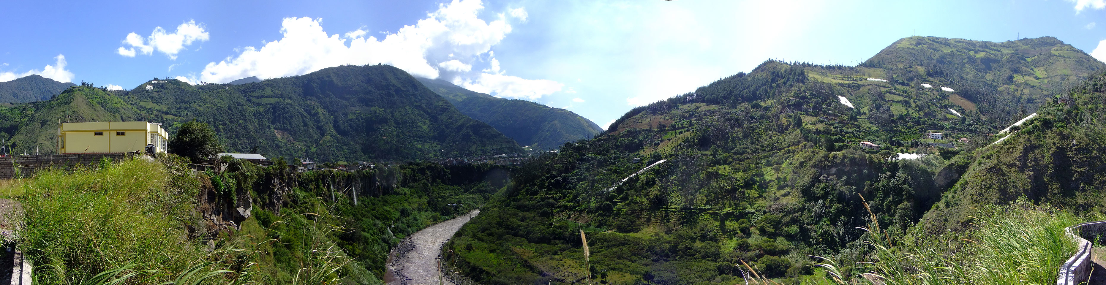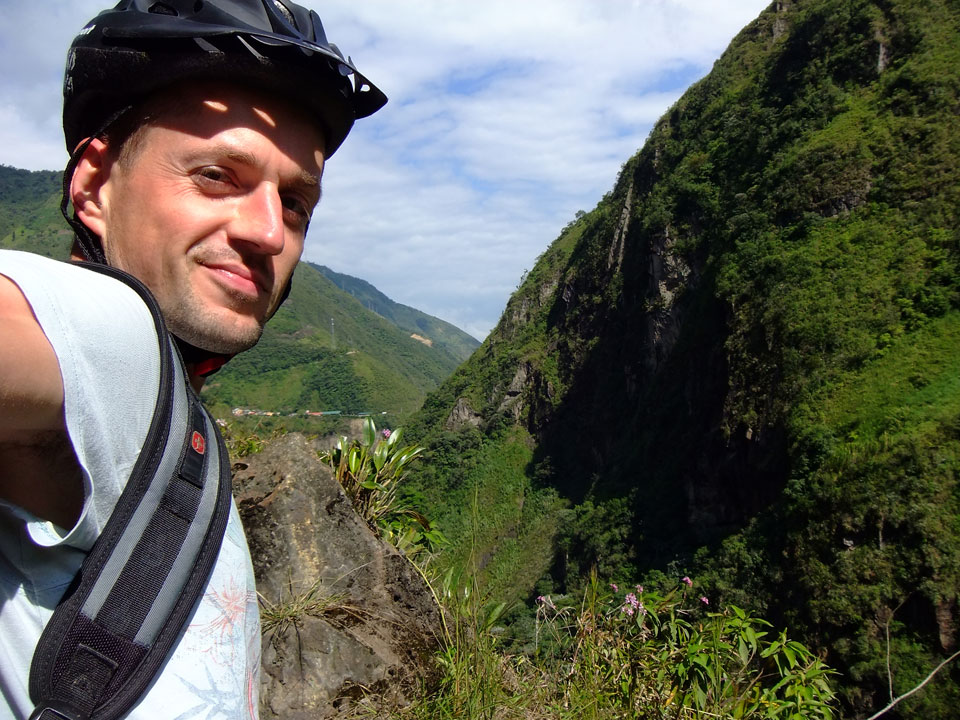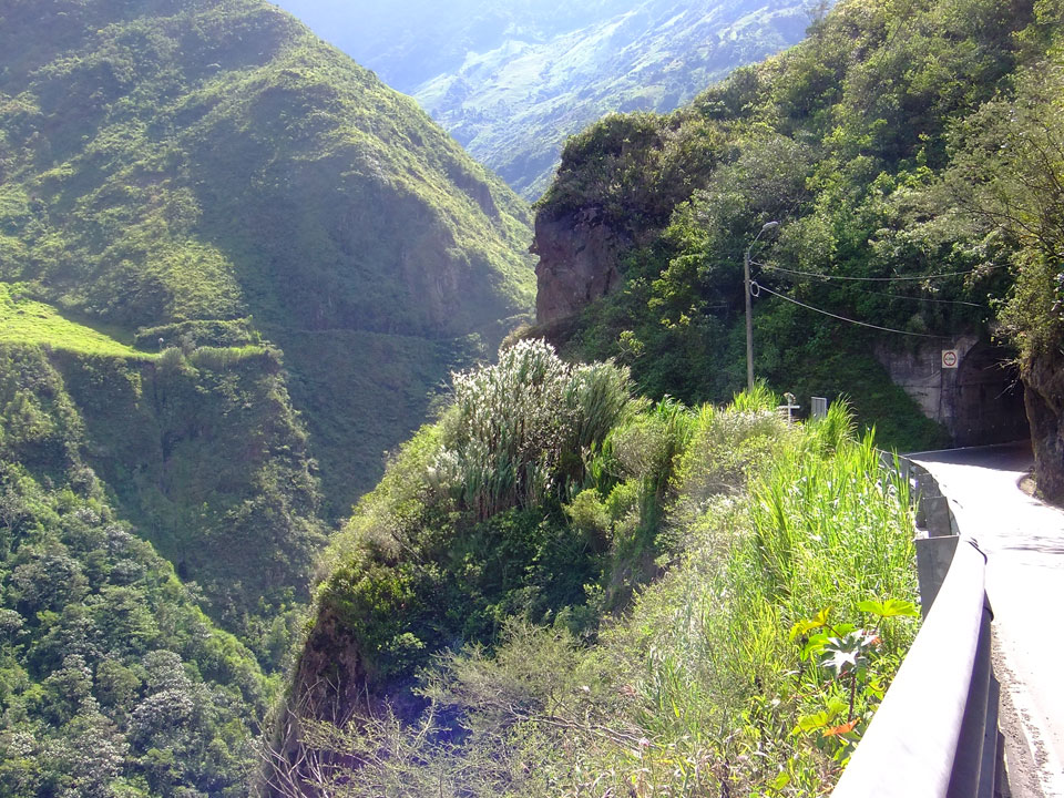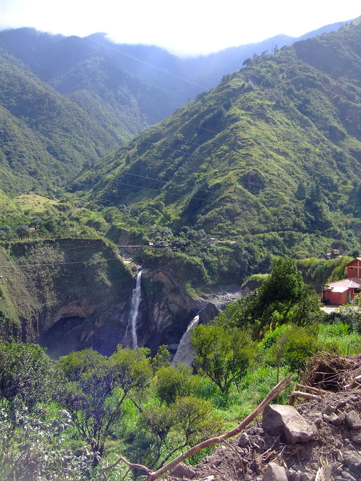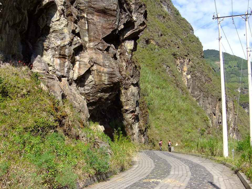 Ganz nett die ganze Sache, viel Sonne und die Straße auch in gutem Zustand. Einige Mal musste man am Tunnel vorbei auf dem Fahrradweg. Die Berge rings um Baños sind eindrucksvoll, viele Wasserfälle. In der Höhe der Berge waren auch so manche Canopys aufgezurrt. Für $10 hätte ich was machen können, alleine aber uninteressant. Bungie gibt’s auch, es gibt eben alles.