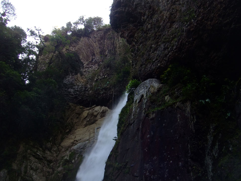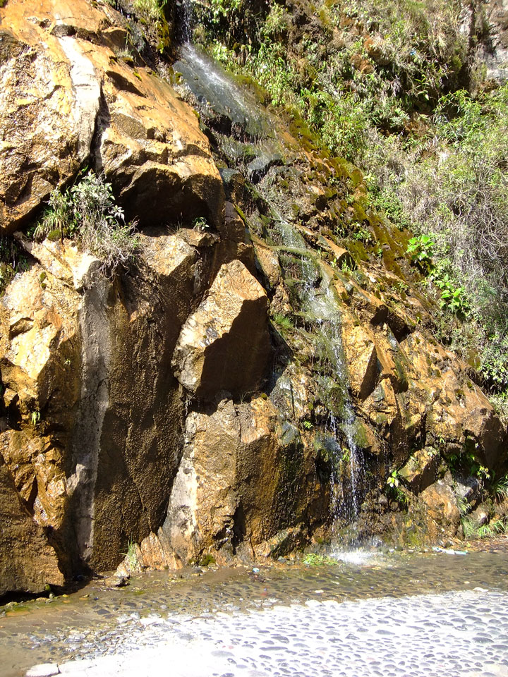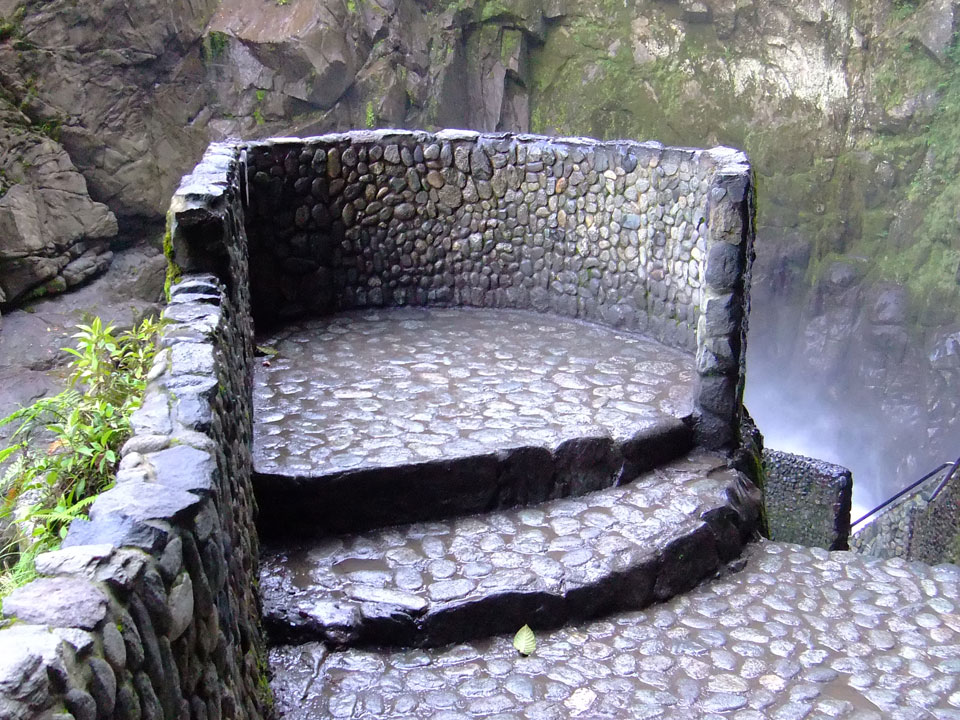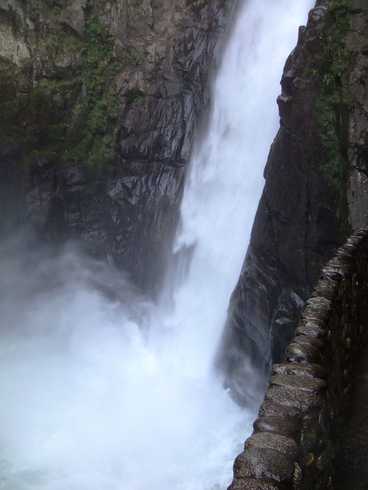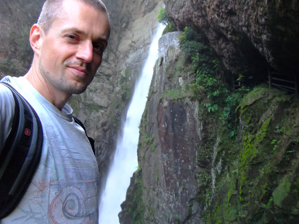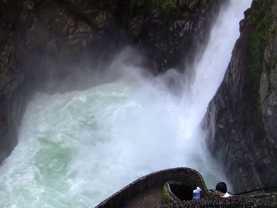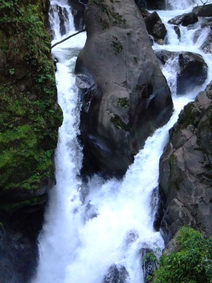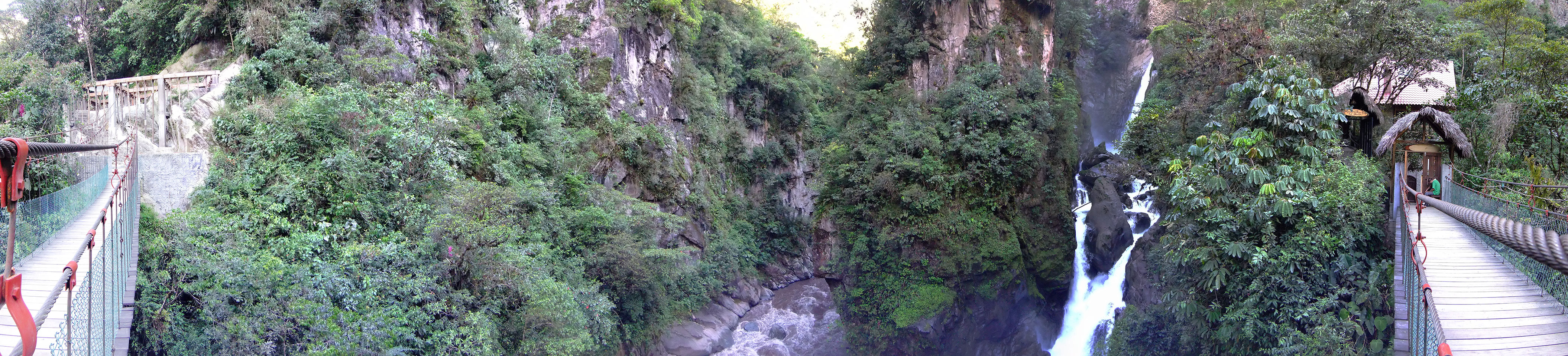 Ich kam dann zum Wasserfall. Für $1.50 rein. Beeindruckend viel Wasser platschte herunter und mit der Nähe war auch viel Wasser in der Luft. Ich kroch noch einen Miniweg weiter hoch, wo es noch nasser und näher am Wasserfall war. Man konnte ihn quasi mit der Hand berühren. Ohne wasserdichte Camera beschränkte ich die Zeit da oben, war happy und fuhr mit einem Pickup-Truck für die Radler wieder zurück nach Baños.
