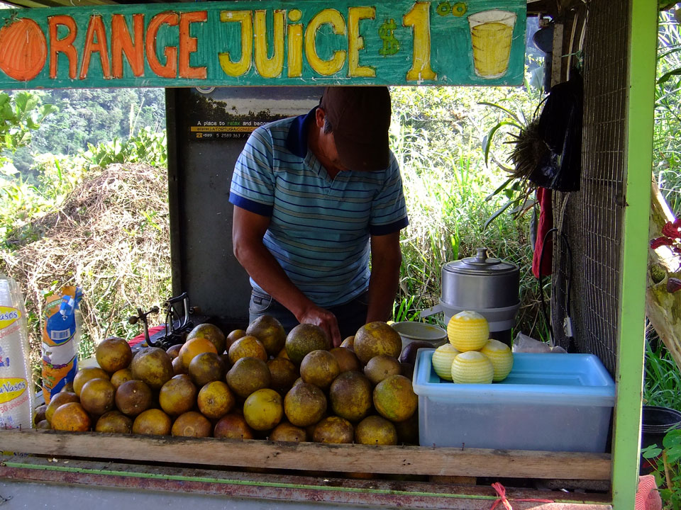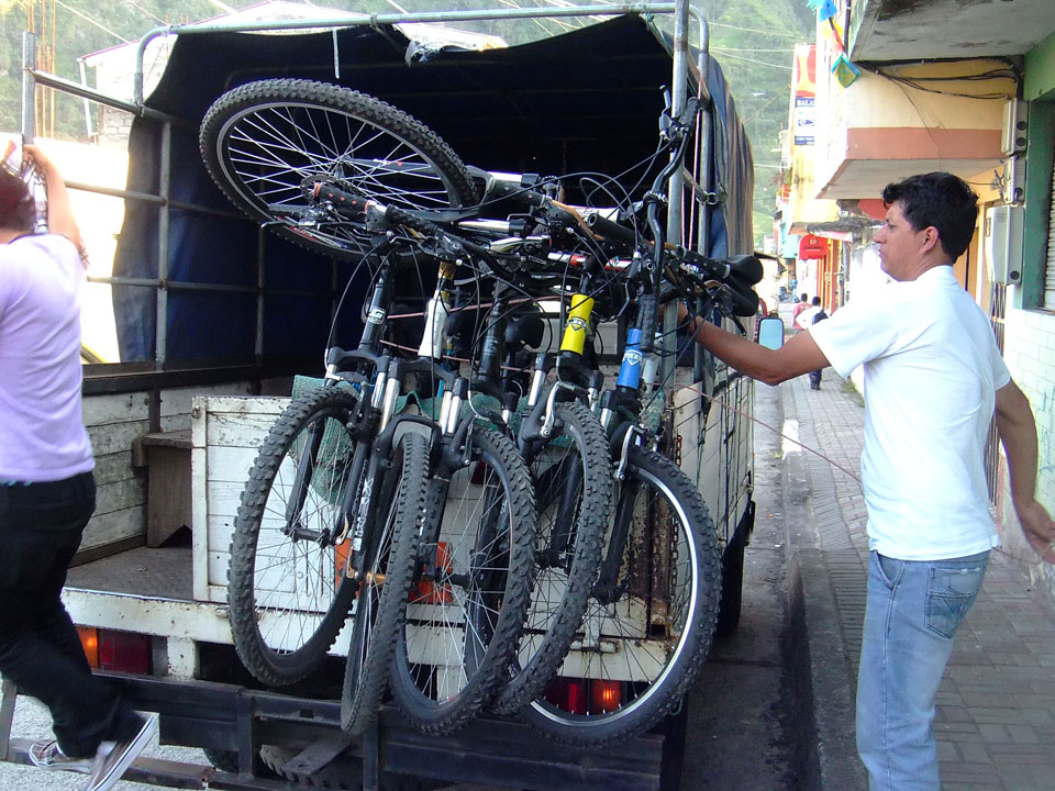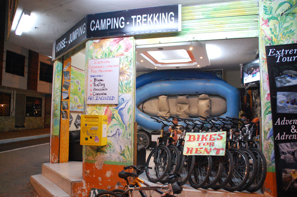 Die Straße nach Puyo geht meist bergab. Um 14:00 mietete ich ein Mountainbike für $6 und meinem Führerschein als Pfand. Mit Helm, Karte und Kompass war ich gut ausgestattet, fand die richtige Richtung dann doch erst nach Nachfragen.