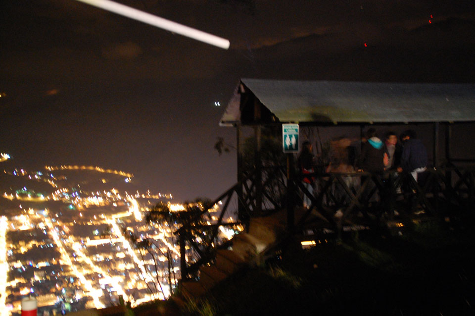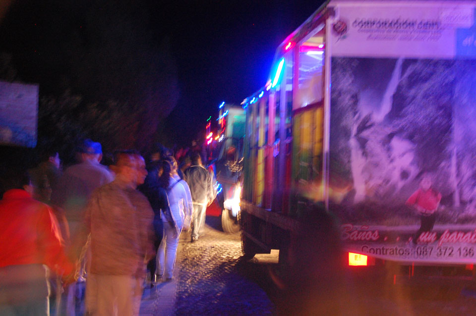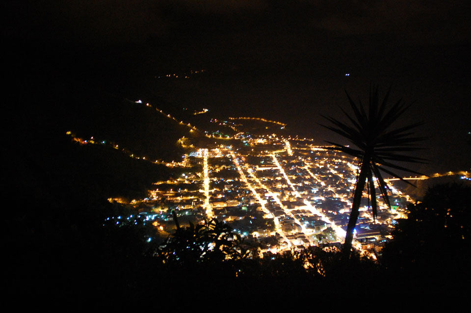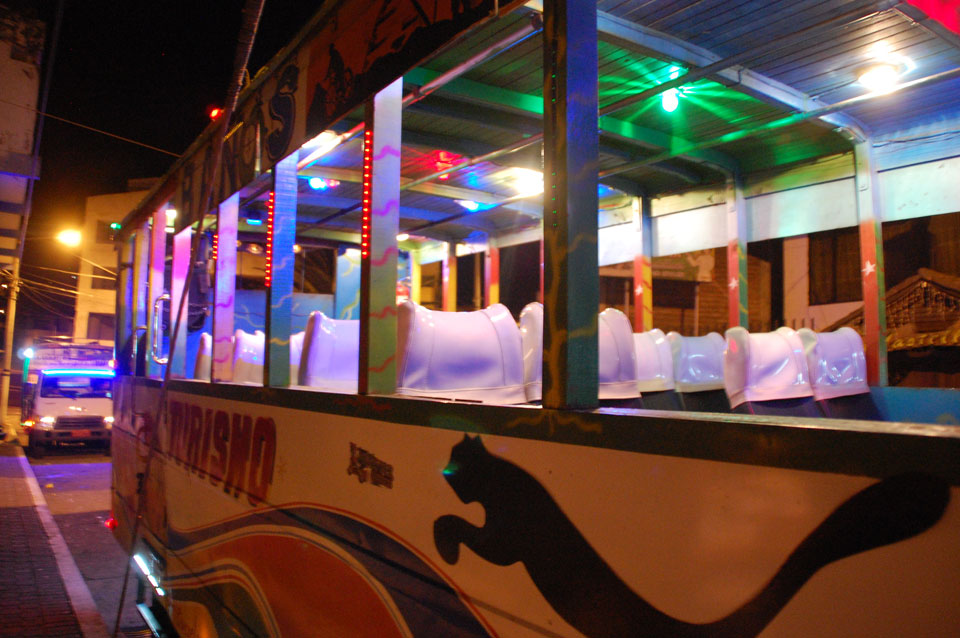 Kurz vor 21:00 schaffte ich es noch in ein Restaurant, schaufelte ein Steak mit Reis in Minuten ‚rein. Die Tour zum Chiva Aussichtpunkt ($5) geht mit Discobussen. Eine Familie nutzte die Tanzfläche im hinteren Teil und hatte viel Spaß. Ich fand’s OK. Der Vulkan war von Wolken bedeckt, Baños sah aber in der Nacht von hier oben auch nett aus. Das erinnerte mich etwas an die Sicht vom Runyon Canyon auf LA, hier höher aber die Stadt natürlich kleiner.