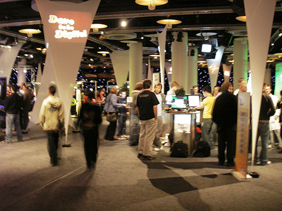 Das Ticket kam 3 Pfund, in der unteren Etage war die Mini-Spiele-Messe. Das war doch alles sehr mini. Hier ein paar XBOXs, da Nintendo DS, PCs und ein paar Kinder. Viel mehr hatte ich nicht erwartet. Ich spielte vieles und langweilte mich nach ’ner Stunde. Zelda auf GC sieht gut aus, Burnout Revenge war auch nett. Ansonsten halt alles schonmal dagewesen. DS mit Nintendogs drauf sah ich nicht. Wenigstens hüpfte ein Hund herum, vorm Centre stand noch ein Webebus. Niemanden hat’s interessiert.