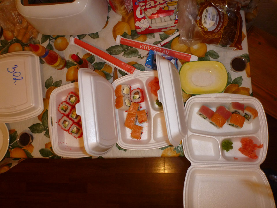 Abends gingen wir groß einkaufen. Es wurden dieses Mal RUB 2700. Nach so viel Anstrengungen war die Energie zum Kochen weg. Stattdessen bestellten wir Sushi (RUB 700) und ich war auch wieder sehr zufrieden damit. Viel Geld ging heute raus, war aber alles notwendig.