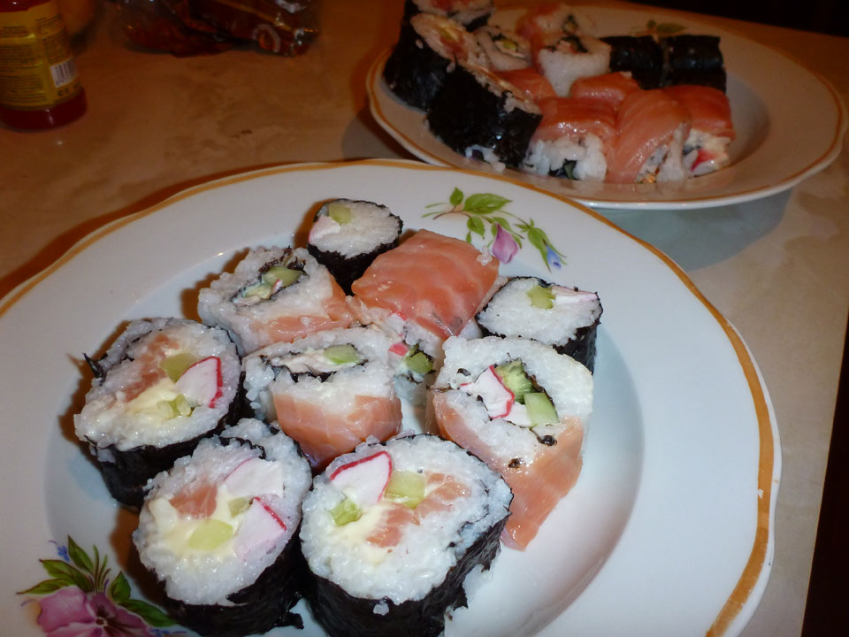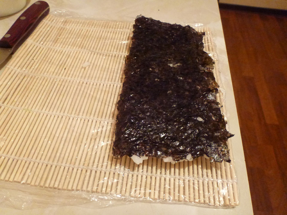Sushi bauten wir zu Hause wieder selber zusammen. Jetzt kamen auch Rollen mit Reis außen dran. Der Trick ist eine Umhüllung der Bambusmatte. Am Ende waren es so viele Rollen, dass ich 4 Stück übrig ließ.
