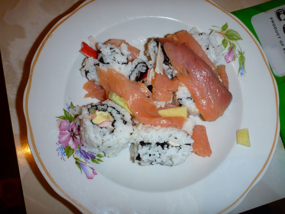 Wir machten Sushi. Meine Rolle landete mit dem Teller auf dem Boden. Wenigstens der Teller blieb heil, die Sushi Role fiel auseinander.
