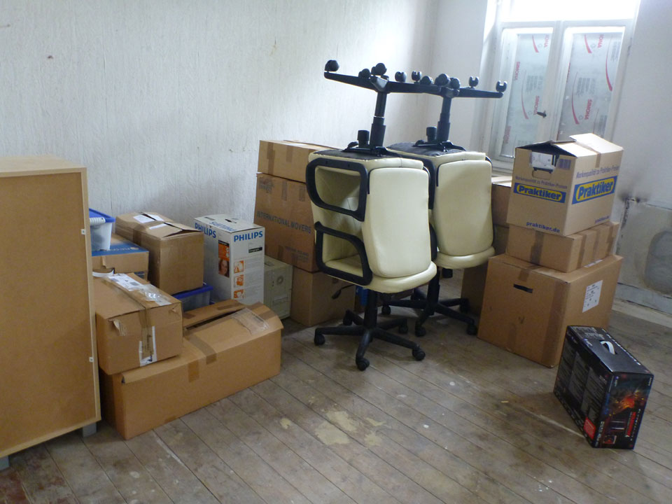Die erste Fuhre mit allen Tischen, Regalen usw. ging in den Lagerraum. Ich hatte einen Hexenschuss, der erst langsam abklang. Jetzt im Lager sind also alle möglichen Sachen bis zum nächsten Versuch oder wasauchimmer.