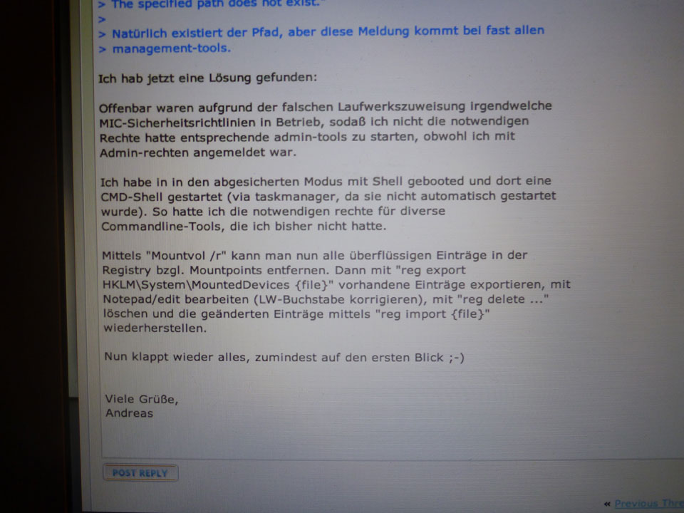 Ich war am Verzweifeln! Im Netz sagten alle bei ähnlichen Problem: einfach alles neu installieren oder Vista reparieren über Installations-Disc. Endlich fand ich was – im abgesicherten Modus mit Eingabeaufforderung ging das dann auch ohne export/import der registry als Textdatei. Ich konnte die registry umschreiben – K auf C ändern und dann klappte das alles. Der SSD Klon funktionierte leider nicht – das will ich aber nicht aufgeben, nur habe ich momentan keine Zeit. Es wurde weiter nach 3 in der Nacht, als dann alles wieder im alten Zustand funktionierte. Mit Windows braucht man kein zweites Hobby.
