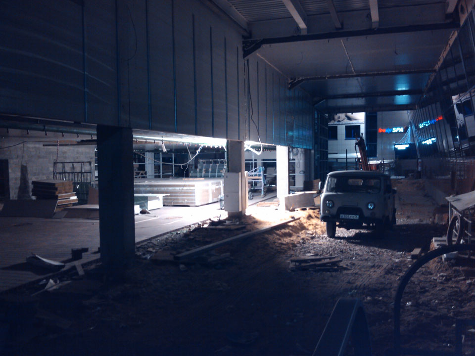 Nur ein paar Stunden Schlaf und es war schon 16:00 nachmittags. Frühstück und dann los mit der Marshrutka Richtung Atoll. Die 5 fuhr so, wie ich dachte – falsch. Zu Fuß dann über den Boulevard Pobedi, wo ich sah, dass endlich an der Bau-Ruine gearbeitet wird. Sehr gut!